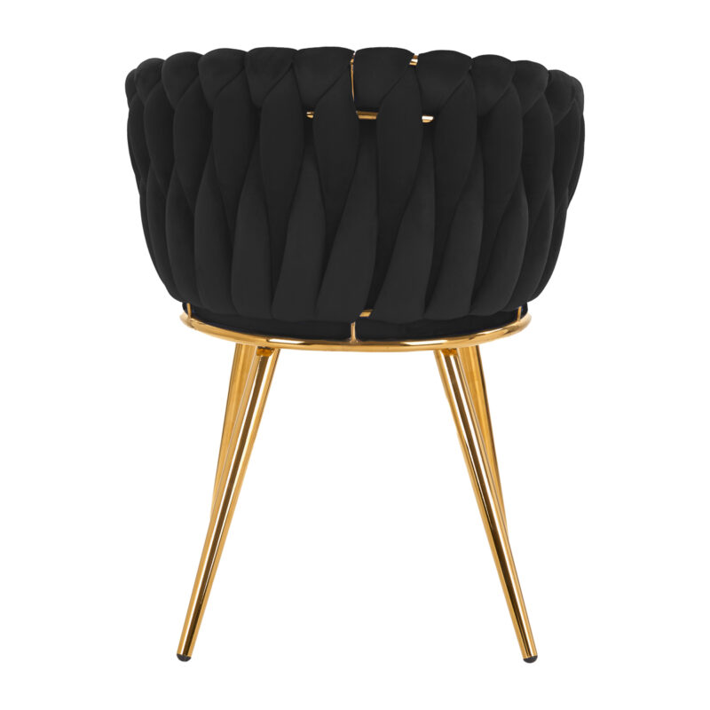 Przyjemne w dotyku, welwetowe obicie w odcieniach czerni nadaje krzesłu wyjątkowego charakteru, a estetycznie przeplatany materiał na oparciu podkreśla unikatowy wygląd mebla. Nadaje mu to ekskluzywny wygląd i zapewnia komfort użytkowania. Stelaż w odcieniach złota dodaje elegancji i prestiżu, idealnie komponując się z welwetem. Eleganckie krzesło 4Rico jest wyjątkowo komfortowym meblem, który stanie się ozdobą recepcji każdego salonu kosmetycznego.