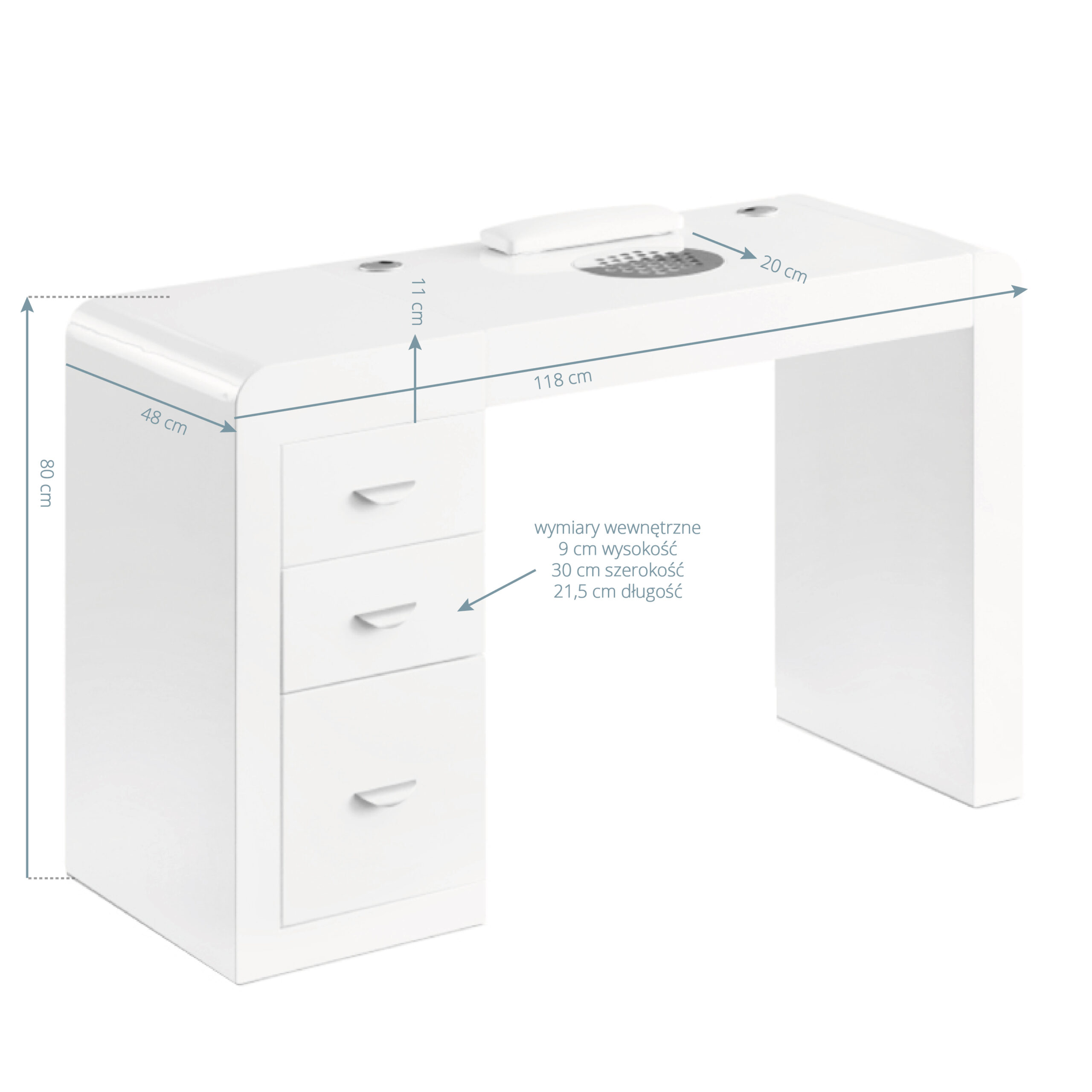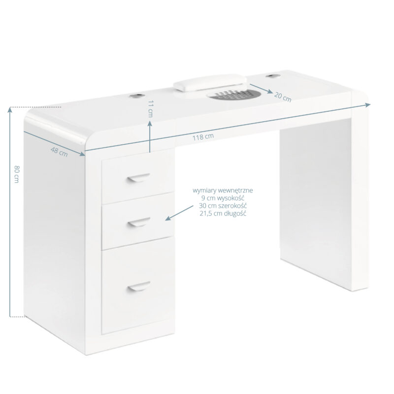 Trzy obszerne szuflady ułatwiają organizację oraz utrzymywanie porządku w najpotrzebniejszych kosmetykach i narzędziach. Biurko wyposażone jest w praktyczny pochłaniacz, który skutecznie ogranicza ilość szkodliwego pyłu, zapewniając czyste i świeże powietrze w miejscu pracy. Jednocześnie dzięki wbudowaniu go w blat nie zajmuje cennej przestrzeni roboczej. Specjalnie zaprojektowane miejsca na kable ułatwiają organizację niezbędnych w salonie urządzeń, takich jak frezarki, lampy zabiegowe czy do paznokci, pozwalając na ukrycie przewodów.