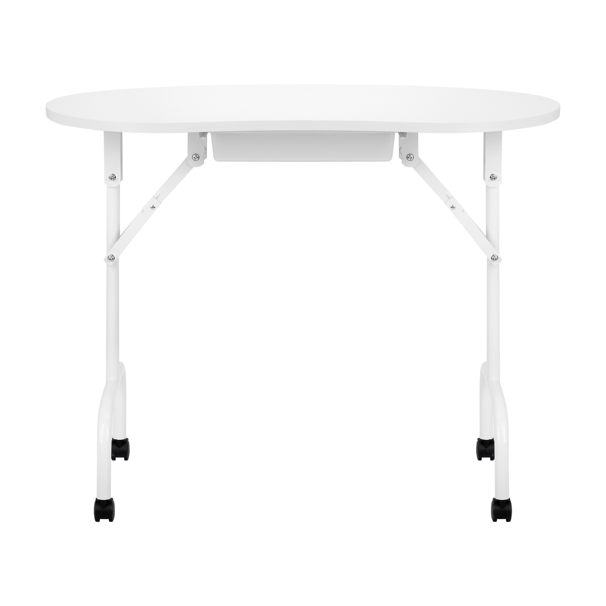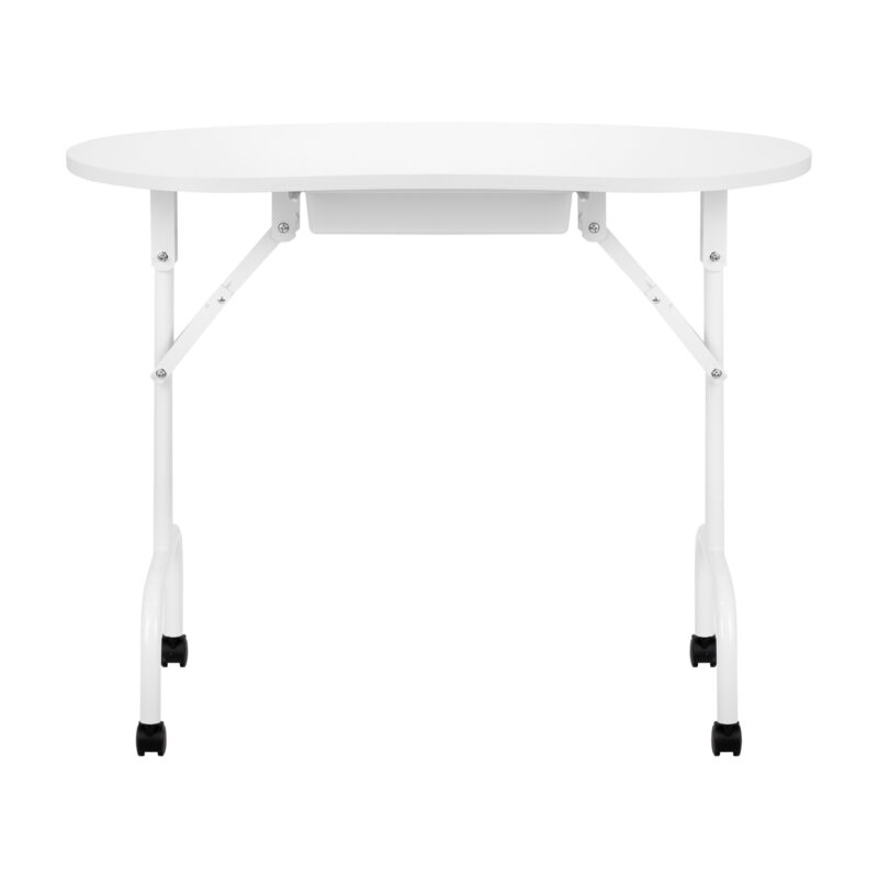 Niewielkie rozmiary złożonego stolika pozwalają na łatwe przechowywanie oraz komfortowy transport mebla, co jest kluczowe w przypadku usług mobilnych. Pod blatem znajduje się miejsce na kuwetę, w której można ułożyć wszelkie najpotrzebniejsze produkty i akcesoria. Taka szufladka zapewnia łatwy dostęp do niezbędnych podczas pracy narzędzi. Poduszka do manicure uefektywnia przeprowadzanie zabiegów, pozwalając klientowi na przyjęcie odpowiedniej, komfortowej pozycji. Biurko jest łatwe do składania, co znacząco wpływa na wygodę użytkowania. Dołączona do zestawu wytrzymała torba świetnie sprawdzi się w trakcie transportu mebla, ułatwiając jego przenoszenie oraz chroniąc przed uszkodzeniami.