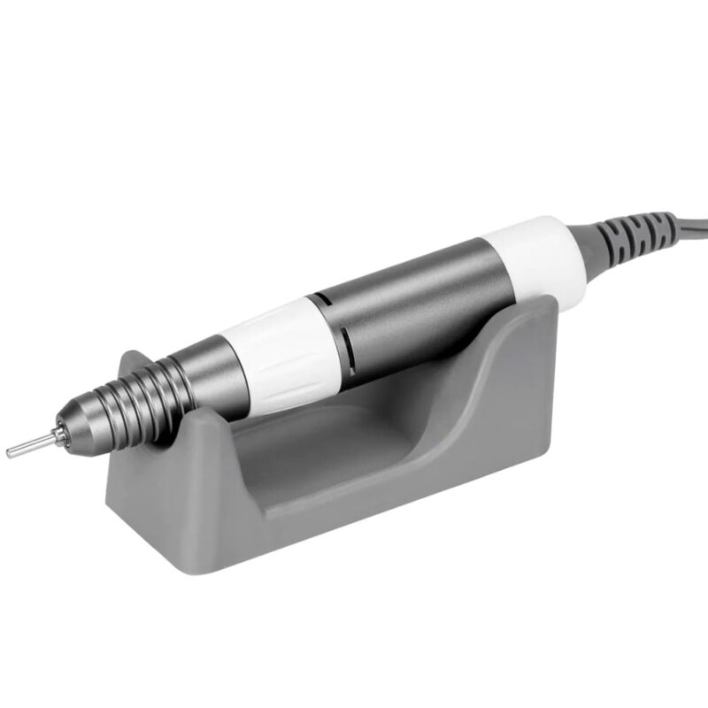 Czerwona dioda obok włącznika sygnalizuje stan pracy urządzenia. Prędkość obrotów głowicy frezarki można w łatwy sposób, płynnie dostosowywać przy użyciu specjalnego pokrętła w zakresie od 0 do 35 000 obrotów na minutę. Przełącznik z przodu urządzenia sprawnie zmienia kierunek obrotów, z kolei ten z tyłu pozwala na przestawianie sterowania – między ręcznym a nożnym. Do zestawu jest dołączony pedał, którego funkcja polega na włączaniu frezarki z uprzednio ustawionymi obrotami. Zapewnia to swobodną, komfortową pracę, dzięki możliwości sterowania urządzeniem bez zajmowania rąk. W trakcie pracy głowicę bezpiecznie można odłożyć na dedykowany silikonowy stojak lub odwiesić dzięki wygodnemu plastikowemu uchwytowi, który da się zamontować po obu stronach urządzenia.