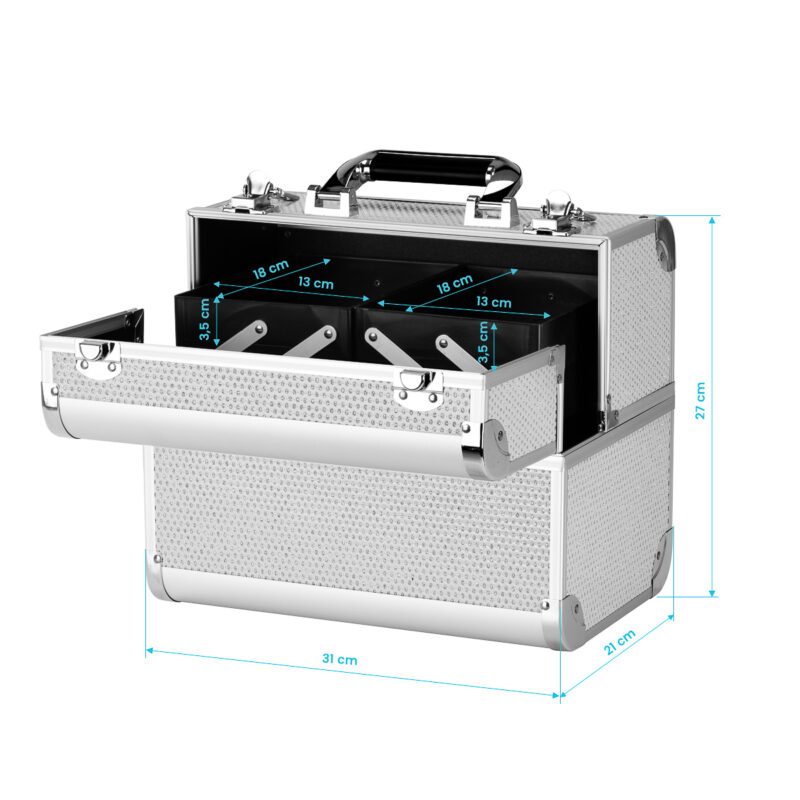 Nowoczesny design w odcieniach srebra z brokatowymi akcentami dodaje elegancji. Rączka ułatwia transport, co jest szczególnie ważne dla mobilnych stylistów. Wykonany z wytrzymałych, odpornych na uszkodzenia materiałów zapewnia komfort użytkowania na co dzień. Solidne zamknięcie na zatrzaski z kluczykiem zapewnia ochronę zawartości, a lekka, trwała konstrukcja sprawia, że kuferek jest łatwy do przenoszenia.