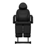 Ukryty pod odpowiednio wyprofilowaną poduszką otwór w zagłówku sprawia, że fotel doskonale sprawdza się zarówno podczas zabiegów na twarz, jak i na ciało. Stabilne podłokietniki gwarantują użytkownikowi odpowiednie podparcie. Elementy te, dzielone w połowie, są ruchome, dlatego dobrze układają się przy zmianach pozycji oparcia, a dodatkowo mogą być w łatwy sposób zdjęte, co ułatwia zajmowanie miejsca w siedzisku.