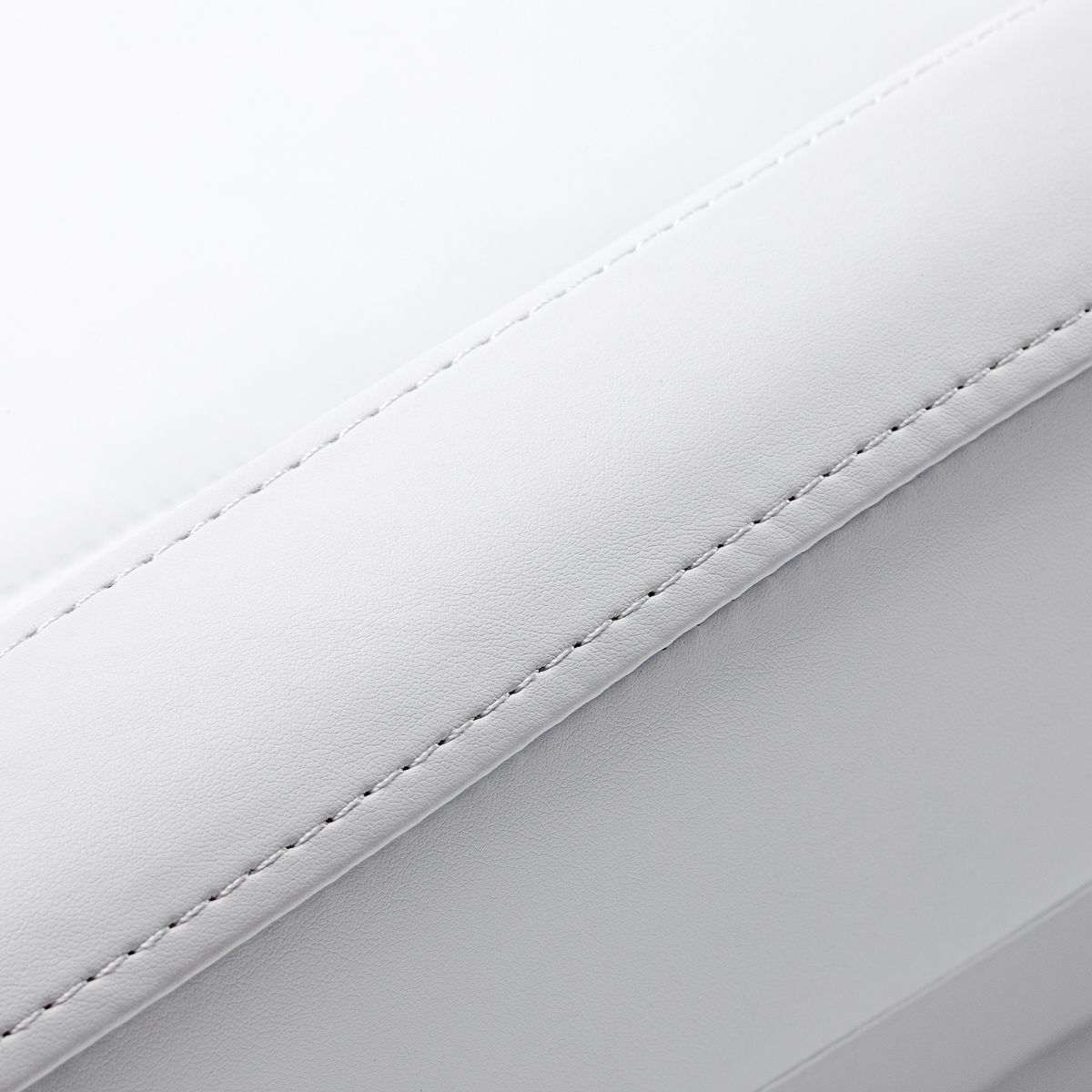 Solidna konstrukcja zapewnia stabilność i wytrzymałość. Wypełnienie z pianki o odpowiedniej twardości dba o komfort, a wysokiej jakości skóra syntetyczna w odcieniach bieli nadaje profesjonalny wygląd i jest odporna na wilgoć oraz łatwa w czyszczeniu. Precyzyjne wykończenia podkreślają nowoczesny charakter i ergonomię siedziska.