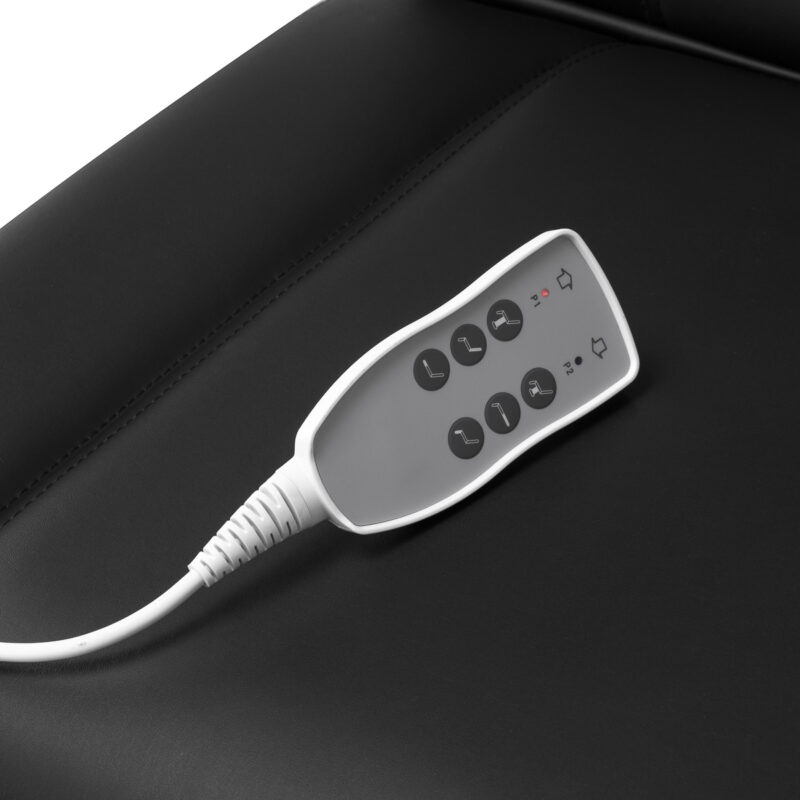 Elektryczny fotel kosmetyczny Azzurro Lux w czerni – 3 siłowniki, pilot przewodowy, zakres wysokości 60-90 cm, długość po rozłożeniu ponad 200 cm. Stabilny, wygodny i łatwy w czyszczeniu – idealny do gabinetów kosmetycznych, podologii i medycyny estetycznej.