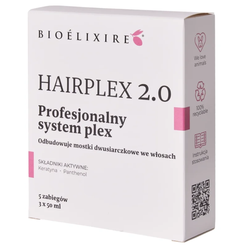 Bioelixire Hairplex 2.0 to trzyfazowy system plex (3×50 ml) do intensywnej regeneracji włosów zniszczonych zabiegami chemicznymi. Formuła z keratyną, pantenolem i proteinami roślinnymi wypełnia mikroubytki, wzmacnia strukturę, przywraca miękkość, gładkość i zdrowy blask, jednocześnie chroniąc włosy przed dalszymi uszkodzeniami.