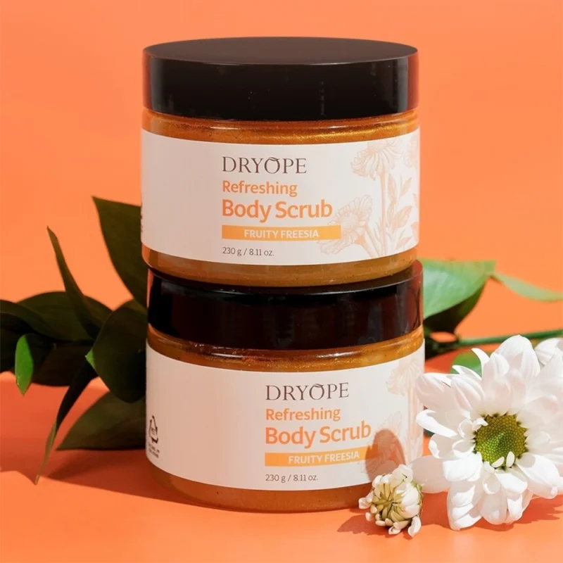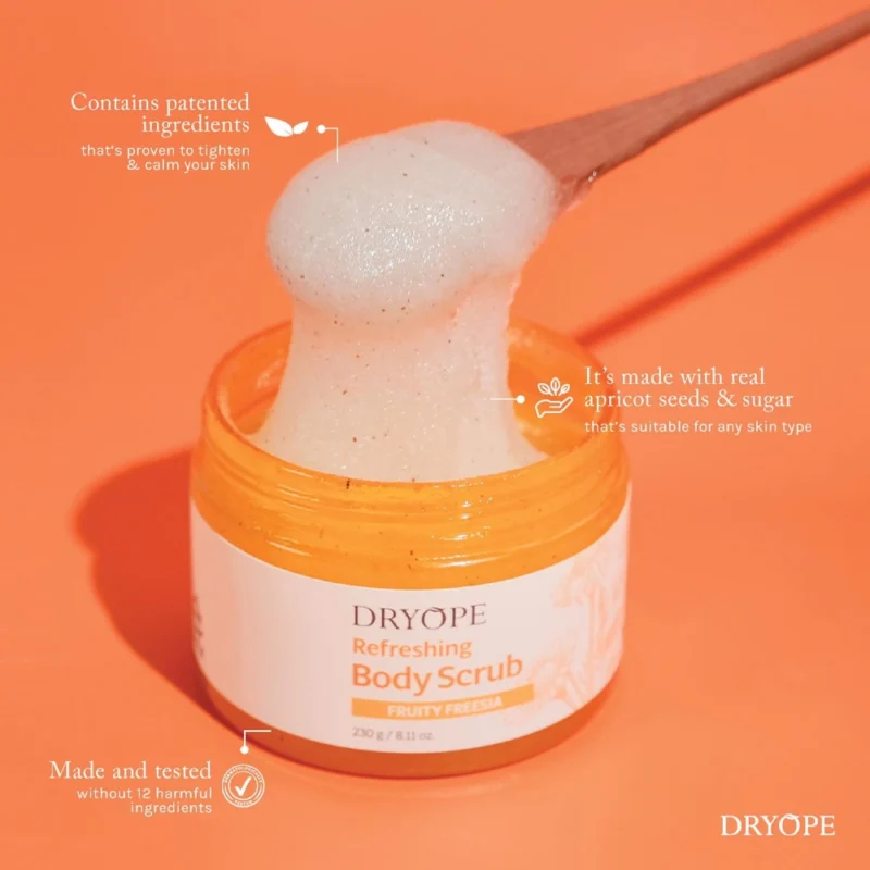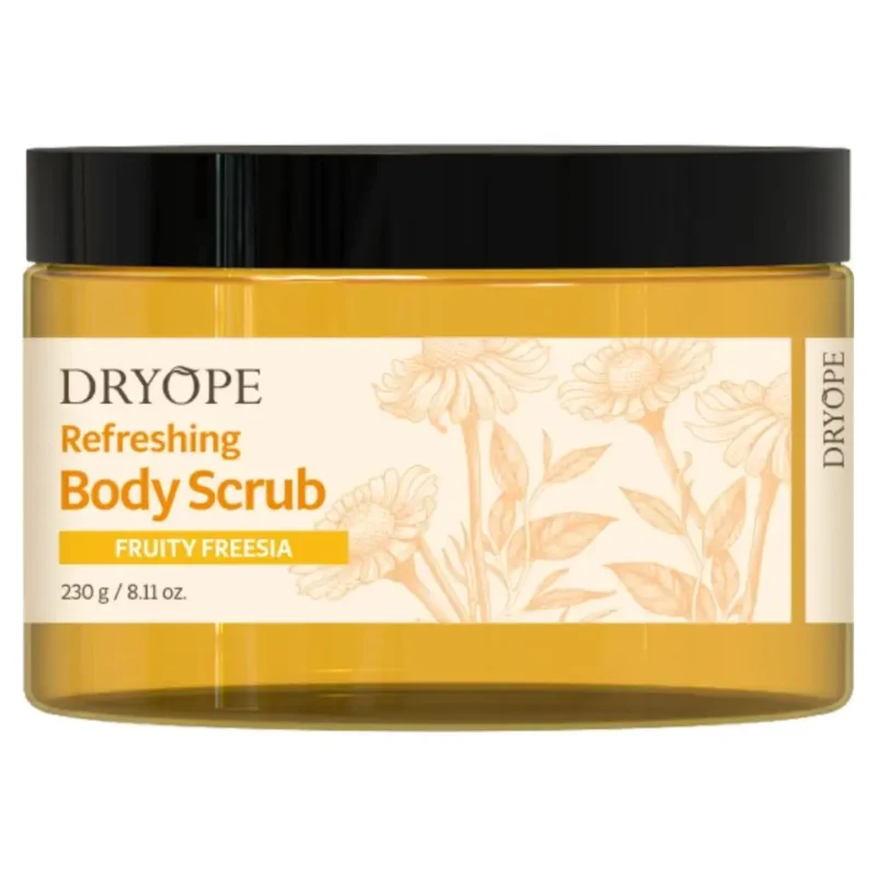 🍑 DRYOPE Refreshing Body Scrub Fruity Freesia – odświeżający peeling do ciała z masłem shea i pestkami moreli (230 ml)