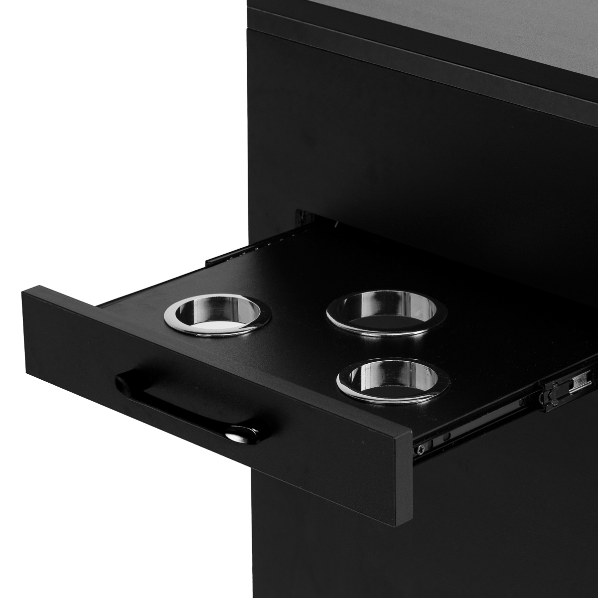 Pomocnik posiada dodatkową boczną, wysuwaną szufladę z metalowymi uchwytami na narzędzia. Trzy otwory świetnie sprawdzą się jako stabilne miejsce na suszarki, lokówki, prostownice lub szczotki, pozwalając wygodnie odkładać sprzęt podczas zabiegu. To rozwiązanie zapewnia swobodny dostęp do najpotrzebniejszych narzędzi bez odkładania ich na blat roboczy.