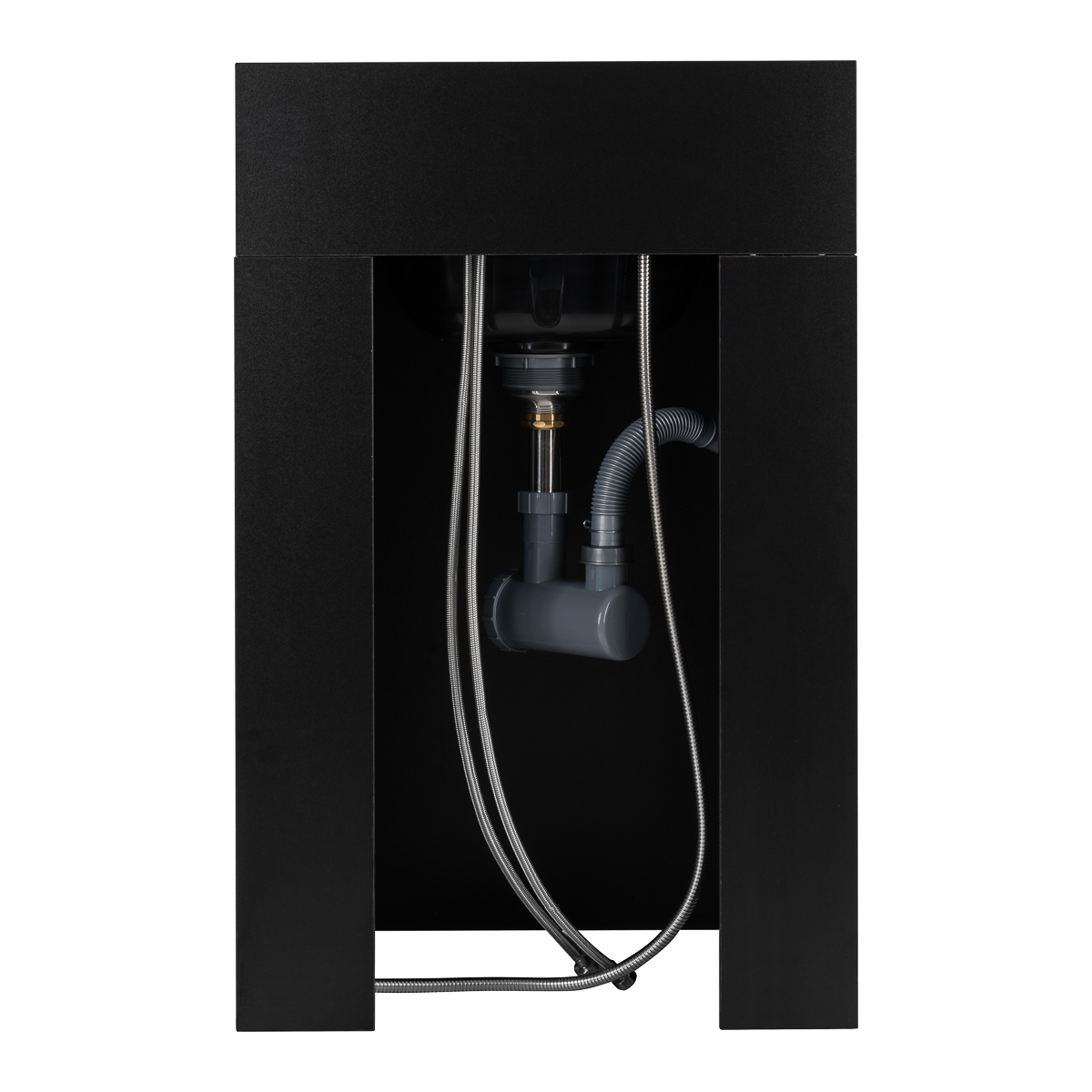 Stacja została wykonana z płyt w odcieniach głębokiej czerni, co nadaje jej elegancki i wyrazisty charakter – doskonale wpisujący się w nowoczesne wnętrza. W komplecie znajduje się armatura w kolorze chromu: bateria, słuchawka prysznicowa oraz elastyczne węże, zapewniające pełną funkcjonalność. Chromowane akcenty doskonale współgrają z matową powierzchnią zabudowy, podkreślając nowoczesny styl i profesjonalne wykończenie mebla.