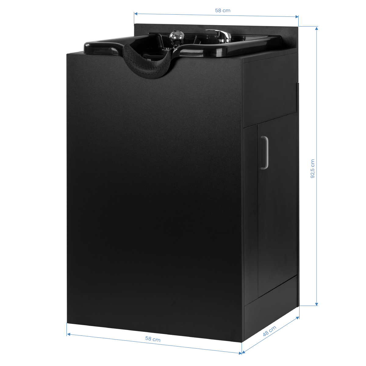 Głęboka misa w kolorze czerni została wykonana z wytrzymałego tworzywa sztucznego, co zapewnia jej odporność na uszkodzenia i łatwość utrzymania w czystości. Jej przemyślana konstrukcja skutecznie ogranicza rozchlapywanie wody i preparatów podczas mycia. Ergonomiczny kształt i wyprofilowany kołnierz z silikonową nakładką zapewniają klientowi wygodne ułożenie głowy. Praktyczne miejsce na słuchawkę natryskową sprzyja lepszej organizacji stanowiska, a korek z sitkiem ułatwia kontrolę przepływu wody i utrzymanie czystości oraz higieny.
