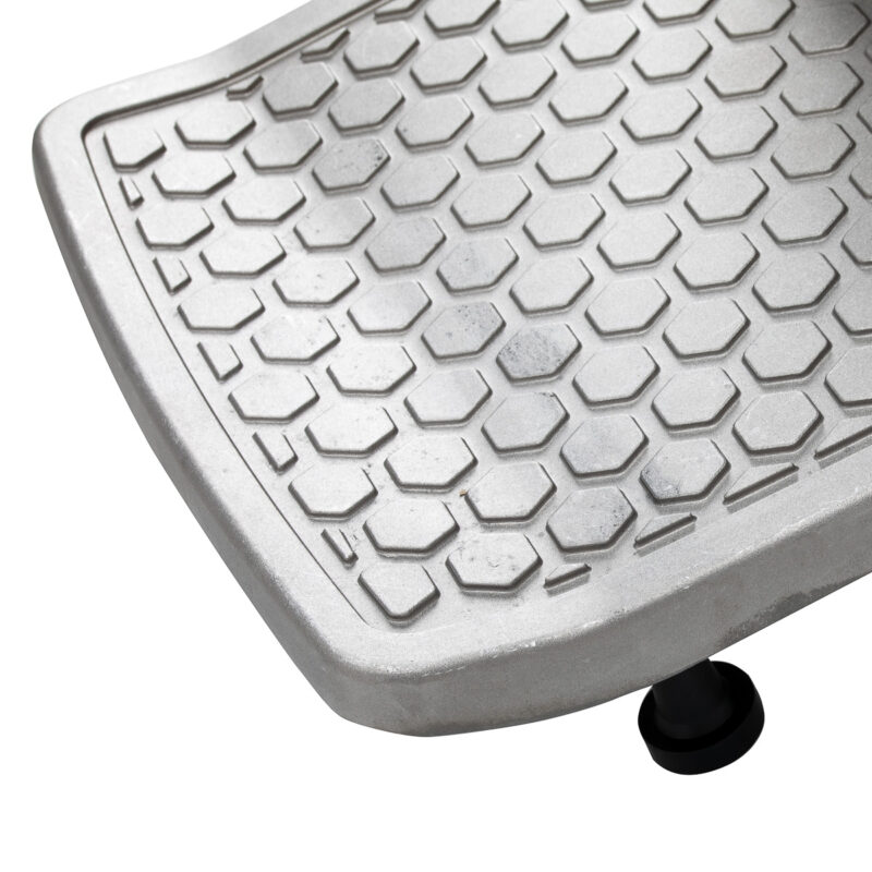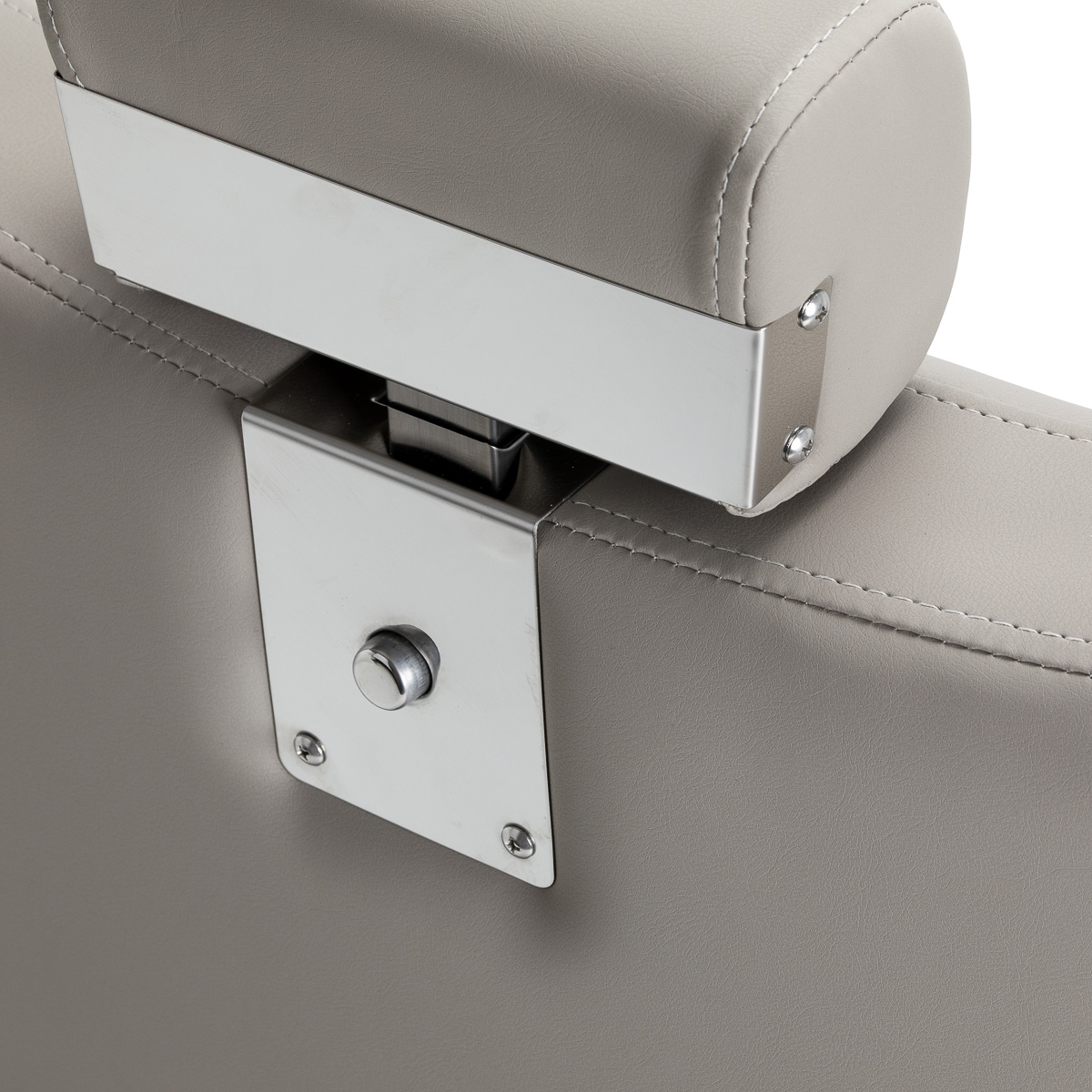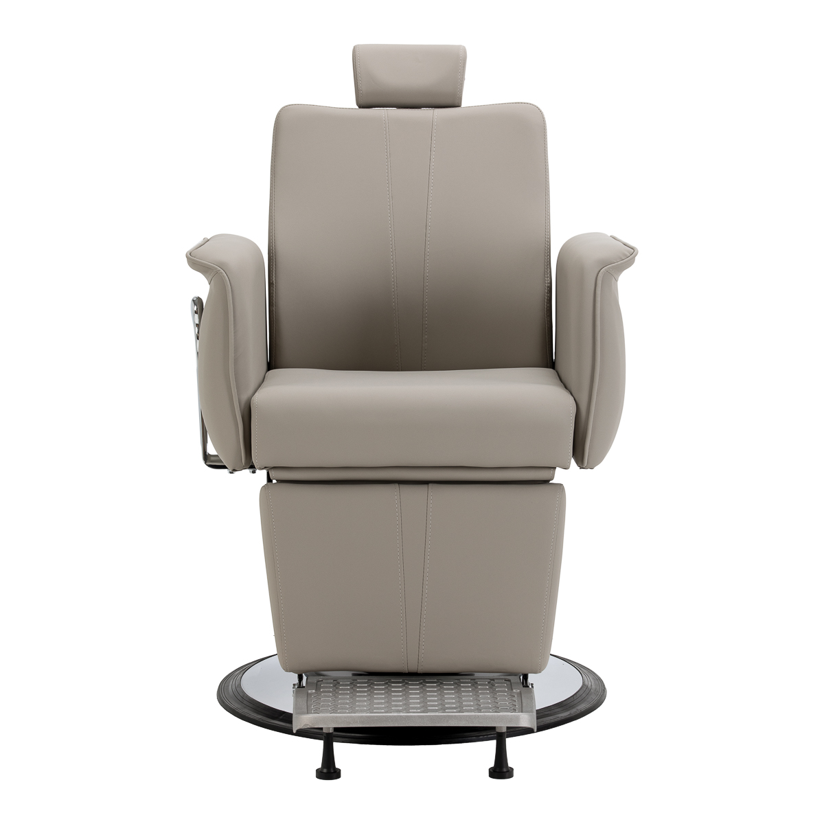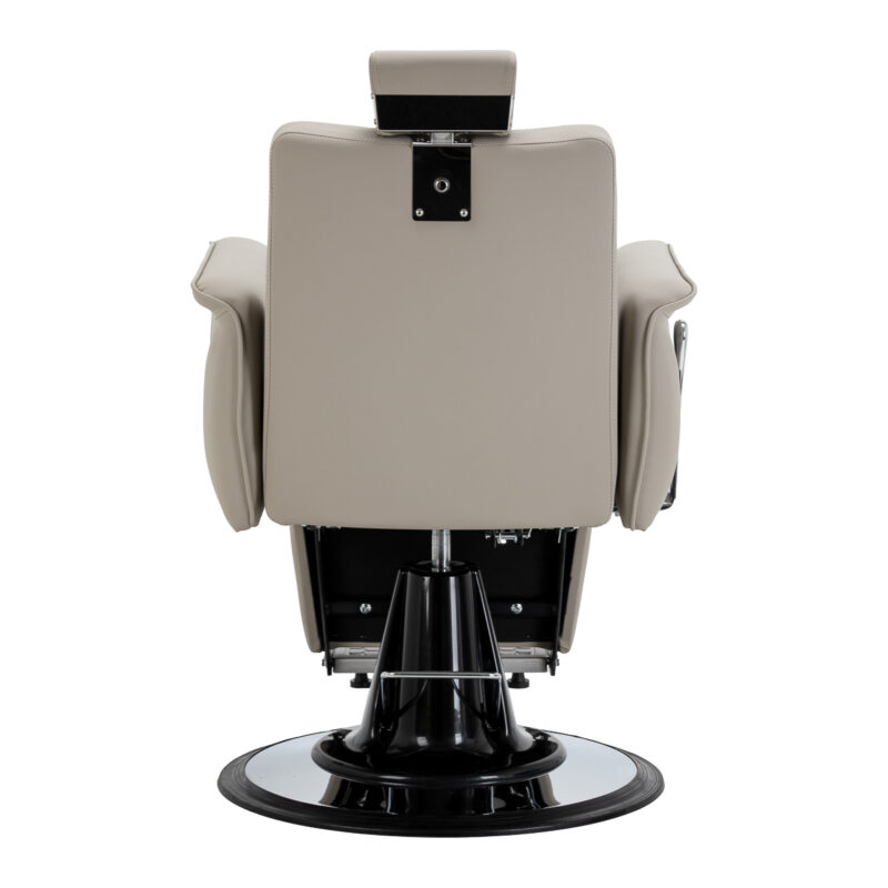 Stabilna, okrągła podstawa z metalowym wykończeniem zapewnia pewne podparcie i bezpieczeństwo użytkowania. Siedzisko, oparcie i podnóżek wypełnione pianką odporną na odkształcenia oraz obite szarą, przyjemną w dotyku skórą syntetyczną zapewniają trwałość oraz wysoki komfort użytkowania. Zastosowane materiały są odporne na wilgoć i łatwe w czyszczeniu, co sprawia, że fotel doskonale sprawdza się w codziennej pracy. Stonowana kolorystyka oraz klasyczna bryła pozwalają na harmonijne dopasowanie do wystroju nowoczesnych i tradycyjnych salonów barberskich.