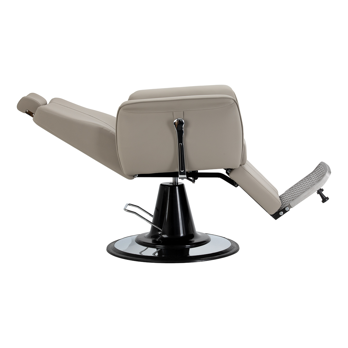 Wydajny podnośnik hydrauliczny umożliwia płynną regulację wysokości siedziska w zakresie 55-67 cm, nawet gdy klient już siedzi w fotelu. Zapewnia to ergonomiczne warunki pracy i ułatwia dopasowanie ustawień do wzrostu zarówno klienta, jak i barbera. Odchylane oparcie oraz regulowany podnóżek pozwalają na ułożenie klienta w wygodnej, półleżącej pozycji, zwiększając wygodę podczas wybranych usług. Regulowany zagłówek zapewnia stabilne podparcie głowy i karku.