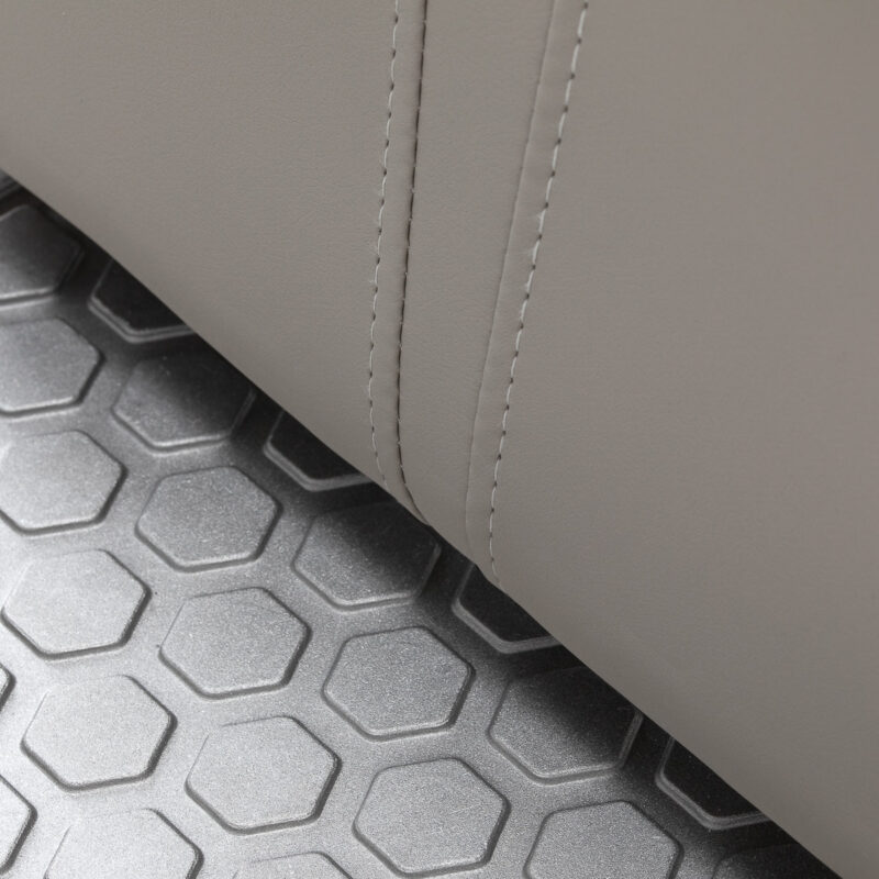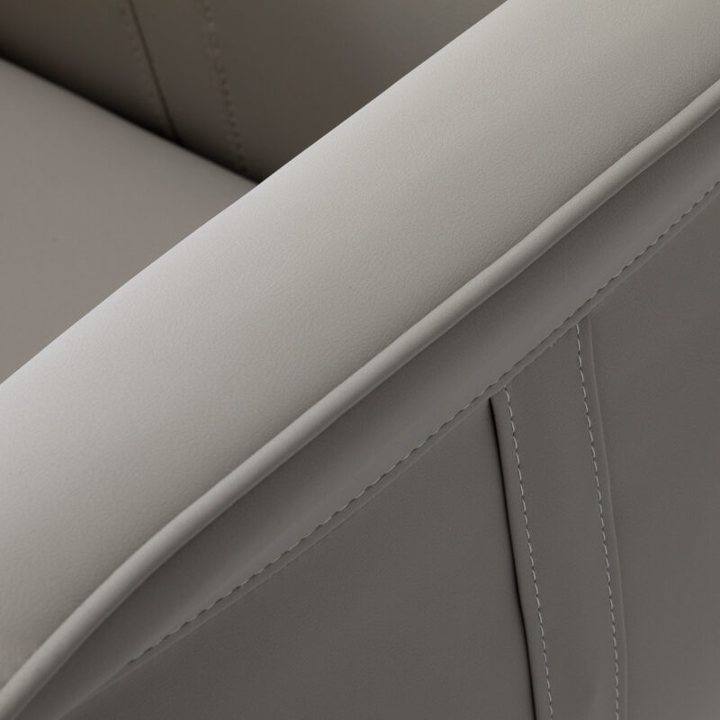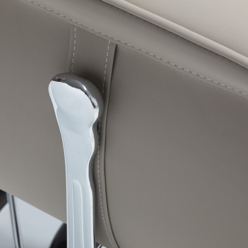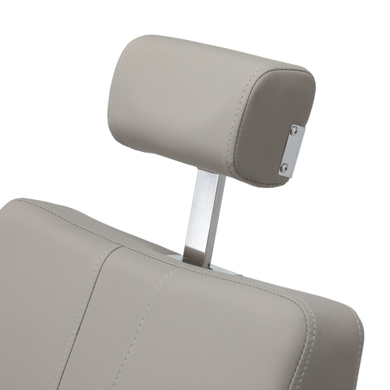 Komfortowe siedzisko zapewnia klientowi wygodę podczas różnorodnych usług. Wysokie oparcie oferuje solidne wsparcie pleców, sprzyjając wygodnej i stabilnej pozycji. Mechanizm pełnego obrotu zwiększa swobodę ruchu i usprawnia organizację pracy. Tapicerowane podłokietniki, umieszczone na optymalnej wysokości, wspomagają prawidłowe ułożenie ramion klienta, ograniczając napięcie w obrębie barków.