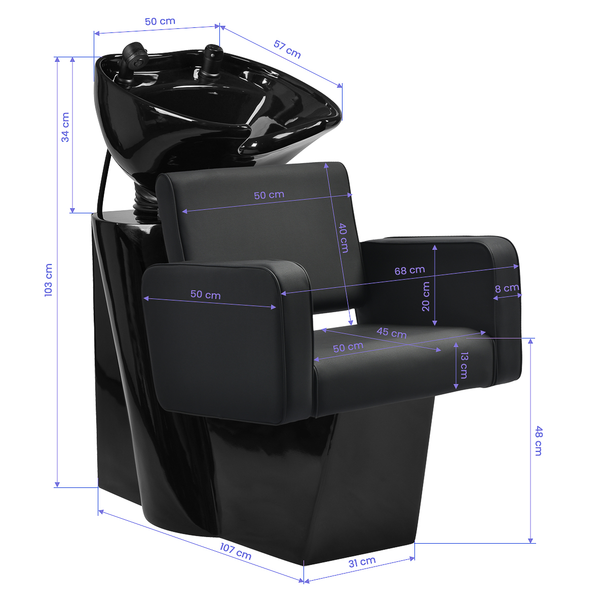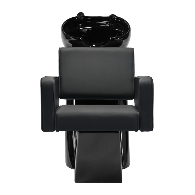 Fotel o geometrycznej formie z miękko zaokrąglonymi krawędziami łączy prostotę i wygodę w nowoczesnym wydaniu. Kwadratowe siedzisko i podłokietniki o łagodnych kątach tworzą harmonijną całość, gwarantując komfortową pozycję podczas zabiegów. Oparcie o optymalnym kącie nachylenia wspiera prawidłową postawę, pozwalając na pełen relaks. Tapicerka z wysokiej jakości skóry syntetycznej w odcieniach czerni jest odporna na zużycie i łatwa do utrzymania w czystości. Geometryczna, nowoczesna forma mebla podkreśla elegancki charakter myjni oraz spójnie komponuje się z aranżacją salonu. W zestawie znajduje się kompletna armatura o matowym wykończeniu w odcieniach czerni, w tym bateria, słuchawka prysznicowa oraz dedykowane węże, aby zapewnić całkowity zestaw narzędzi do pracy.