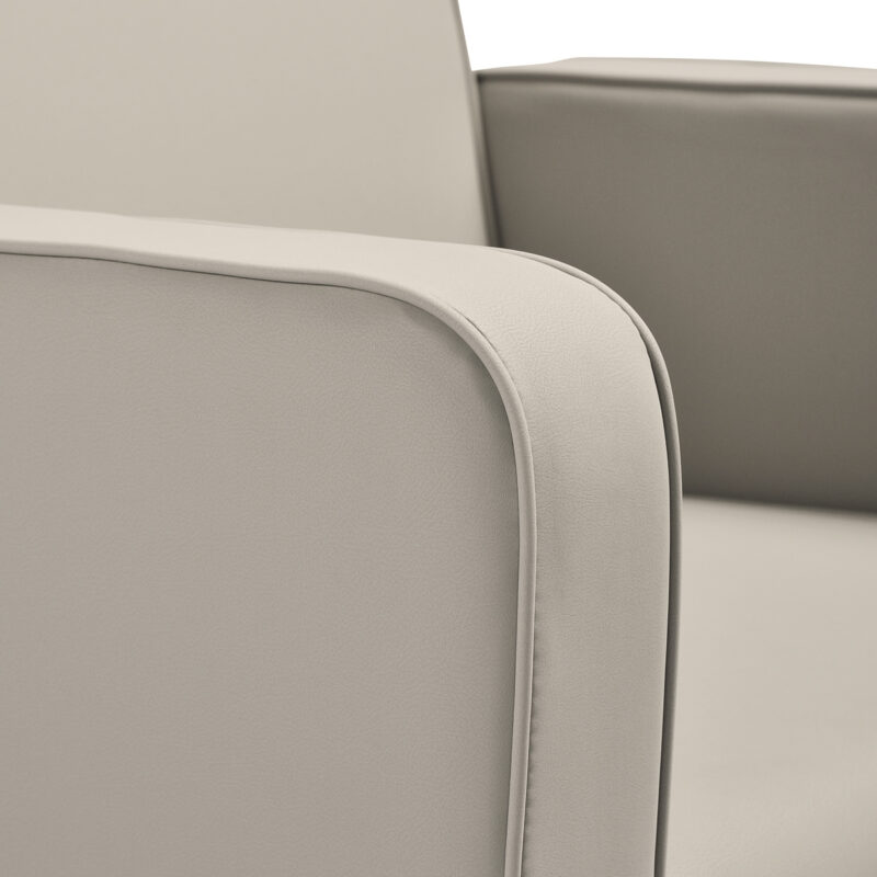 Fotel o geometrycznej formie z miękko zaokrąglonymi krawędziami łączy prostotę i wygodę w nowoczesnym wydaniu. Kwadratowe siedzisko i podłokietniki o łagodnych kątach tworzą harmonijną całość, gwarantując komfortową pozycję podczas zabiegów. Oparcie o optymalnym kącie nachylenia wspiera prawidłową postawę, pozwalając na pełen relaks. Tapicerka z wysokiej jakości skóry syntetycznej w odcieniach szarości i beżu jest odporna na zużycie i łatwa do utrzymania w czystości. Geometryczna, nowoczesna forma mebla podkreśla elegancki charakter myjni oraz spójnie komponuje się z aranżacją salonu. W zestawie znajduje się kompletna armatura o matowym wykończeniu w odcieniach czerni, w tym bateria, słuchawka prysznicowa oraz dedykowane węże, aby zapewnić całkowity zestaw narzędzi do pracy.