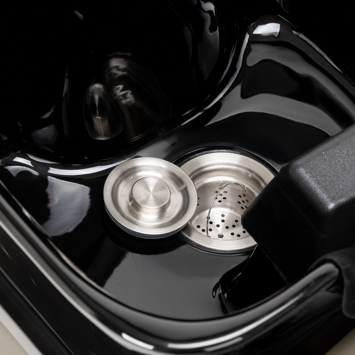 Ceramiczna misa umywalki w odcieniach czerni, o nowoczesnym kształcie i odpowiedniej głębokości, skutecznie zapobiega rozchlapywaniu wody oraz produktów używanych podczas zabiegów, umożliwiając komfortowe i efektywne wykonywanie szerokiej gamy usług. Odpowiednio wyprofilowany kołnierz oraz nachylone oparcie zapewniają wygodę i wsparcie podczas mycia włosów, a nakładka z tworzywa sztucznego w odcieniach czerni chroni klienta przed chłodem ceramicznej powierzchni, gwarantując przyjemne doznania w trakcie zabiegu.