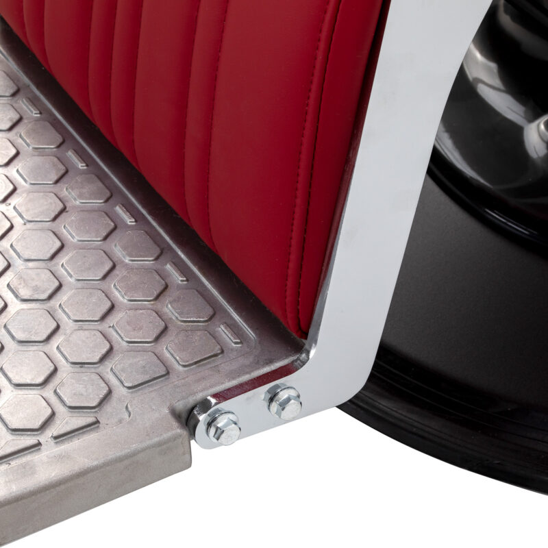 Stabilna podstawa zapewnia pewne podparcie i wysoki komfort użytkowania. Siedzisko wypełnione pianką odporną na odkształcenia oraz tapicerka z matowej skóry syntetycznej gwarantują trwałość i wygodę przez długi czas. Materiały wyróżniają się odpornością na wilgoć oraz łatwością utrzymania w czystości. Bordowa tapicerka zestawiona z metalowymi, chromowanymi elementami oraz dekoracyjnym podnóżkiem nadaje fotelowi wyrazisty, klasyczny charakter. Pionowe przeszycia podkreślają stylistykę vintage, doskonale wpisującą się w klimat profesjonalnych salonów barberskich. Starannie dopracowane detale nadają całości reprezentacyjny wygląd, a funkcjonalna konstrukcja sprzyja komfortowej i efektywnej pracy.