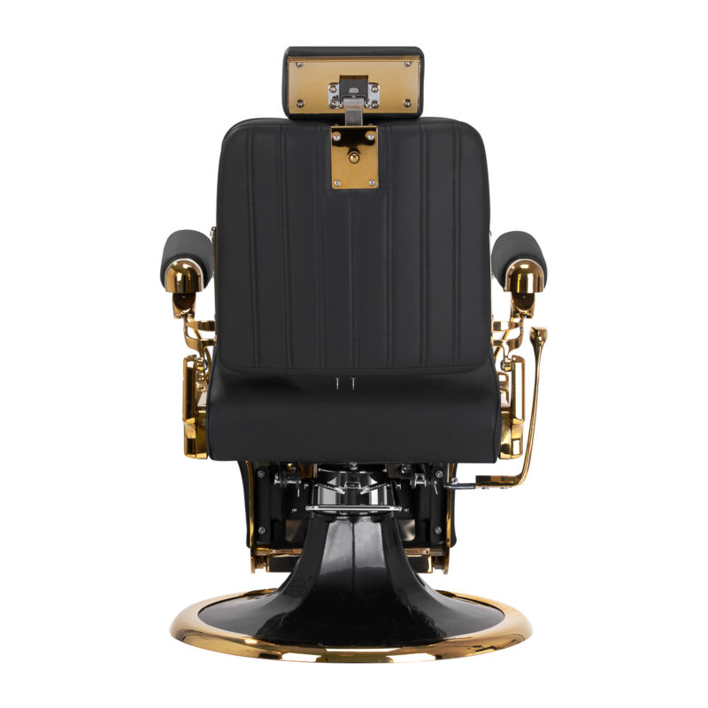 Solidna, szeroka podstawa gwarantuje stabilność oraz wysoki komfort użytkowania. Wypełnienie siedziska wykonane z odpornej na odkształcenia pianki oraz obicie ze skóry syntetycznej zapewniają trwałość mebla i jego komfortowe użytkowanie przez długi czas. Tapicerka jest odporna na wilgoć, wytrzymała oraz łatwa do czyszczenia. Połączenie czerni z elementami złota dodaje fotelowi elegancji, dzięki czemu staje się on efektowną ozdobą wnętrza, idealnie wpisującą się w wystrój nowoczesnego salonu barberskiego.