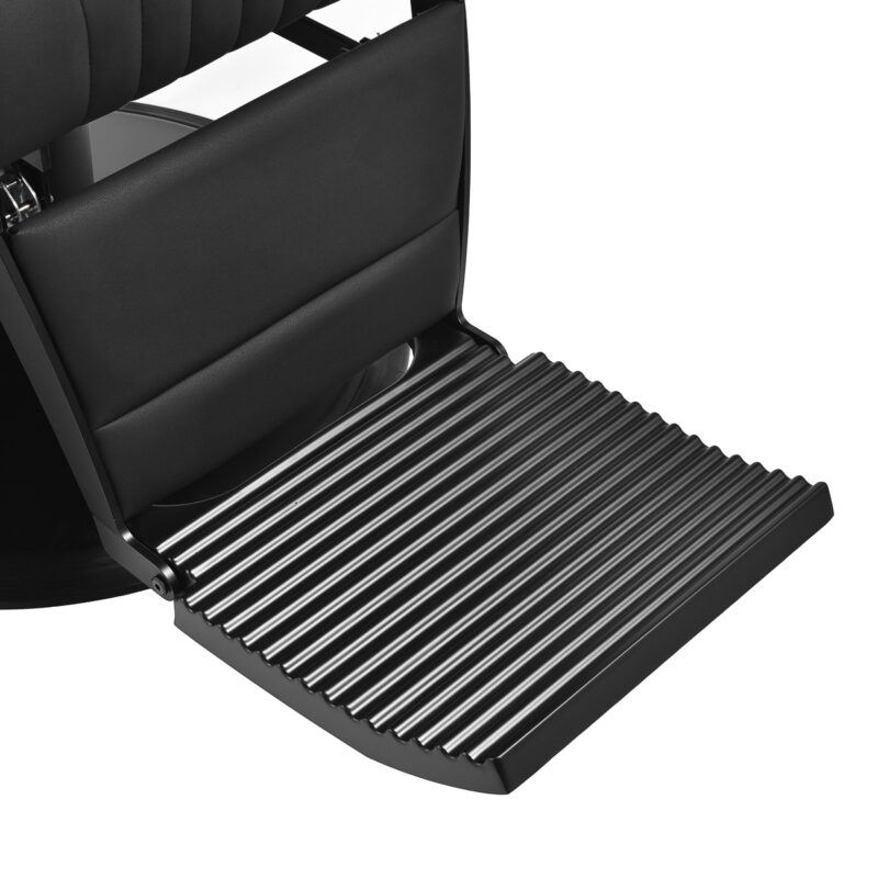 Czarna, okrągła podstawa zapewnia stabilność oraz trwałość użytkowania. Obicie z miękkiej, matowej skóry syntetycznej łączy komfort z wytrzymałością. Zastosowane materiały są odporne na wilgoć, trwałe i łatwe w czyszczeniu. Stylowe przeszycia i tapicerka w odcieniach czerni nadają mu wyjątkowego charakteru, idealnie komponującego się z wystrojem nowoczesnych salonów barberskich. Połączenie eleganckiego odcienia obicia z czarną ramą i podstawą podkreśla nowoczesny, profesjonalny wygląd fotela.