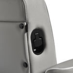 Czarna, okrągła podstawa zapewnia stabilność oraz trwałość użytkowania. Obicie z miękkiej, matowej skóry syntetycznej łączy komfort z wytrzymałością. Zastosowane materiały są odporne na wilgoć, trwałe i łatwe w czyszczeniu. Stylowe przeszycia i tapicerka w odcieniach szarości nadają mu wyjątkowego charakteru, idealnie komponującego się z wystrojem nowoczesnych salonów barberskich. Połączenie eleganckiego odcienia obicia z czarną ramą i podstawą podkreśla nowoczesny, profesjonalny wygląd fotela.