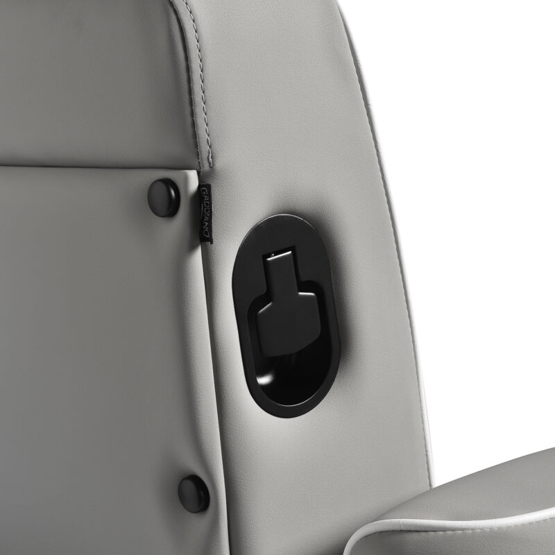 Wydajny podnośnik hydrauliczny pozwala na płynną regulację wysokości siedziska w zakresie 60–76 cm, nawet gdy klient już siedzi na fotelu, co umożliwia ergonomiczne dopasowanie fotela do wzrostu klienta i preferencji osoby wykonującej zabieg. Intuicyjny mechanizm boczny pozwala na łatwe rozłożenie oparcia i podnóżka do pozycji półleżącej, zapewniając komfort podczas bardziej precyzyjnych usług. Wysuwany zagłówek dodatkowo wspiera głowę, zwiększając wygodę użytkowania.