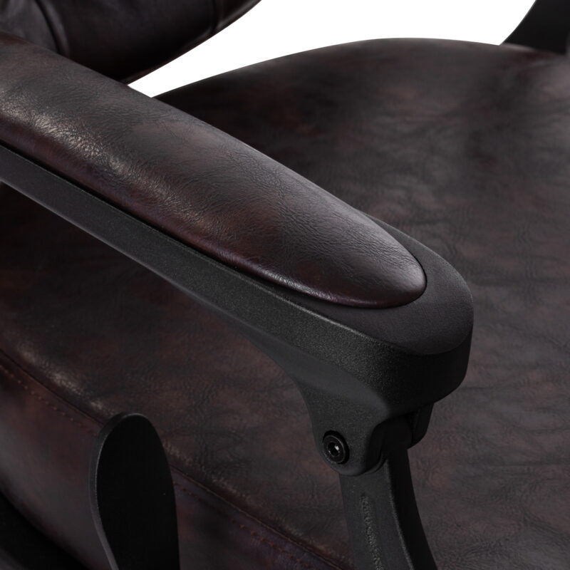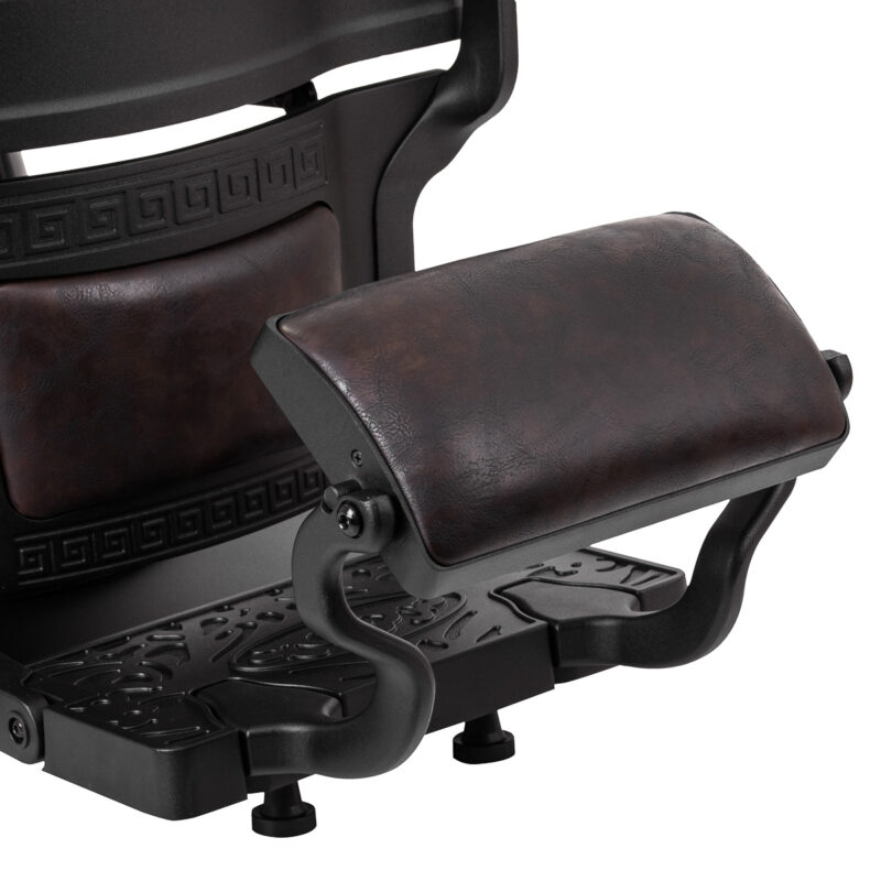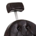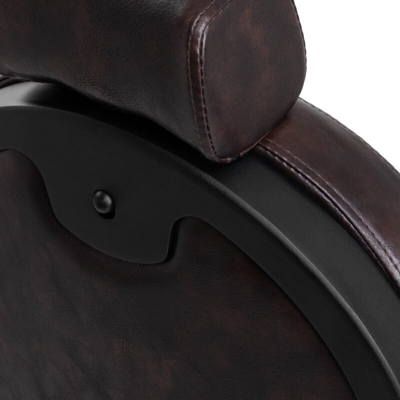 Solidna konstrukcja podstawy zapewnia stabilność oraz wysoki komfort użytkowania. Wypełnienie siedziska z trwałej, odpornej na odkształcenia pianki oraz obicie wykonane z przyjemnej w dotyku skóry syntetycznej o półmatowym wykończeniu zapewniają trwałość mebla i jego komfortowe użytkowanie przez długi czas. Sprawiają również, że sprzęt jest odporny na wilgoć, wytrzymały oraz łatwy do czyszczenia. Pokrycie w odcieniach brązu z pikowaniem i ozdobnymi guzikami nadaje mu wyjątkowego charakteru. Fotel o charakterystycznym designie, nawiązującym do stylu vintage, doskonale wpasowuje się w klimat salonów barberskich, podkreślając ich wyjątkową atmosferę.