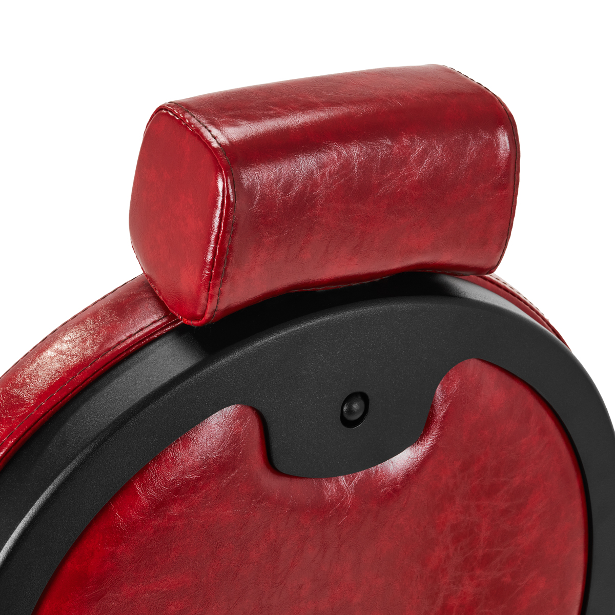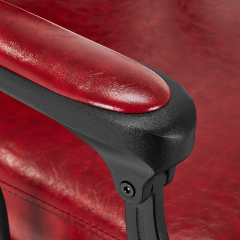 Solidna konstrukcja podstawy zapewnia stabilność oraz wysoki komfort użytkowania. Wypełnienie siedziska z trwałej, odpornej na odkształcenia pianki oraz obicie wykonane z przyjemnej w dotyku skóry syntetycznej o błyszczącym wykończeniu zapewniają trwałość mebla i jego komfortowe użytkowanie przez długi czas. Sprawiają również, że sprzęt jest odporny na wilgoć, wytrzymały oraz łatwy do czyszczenia. Pokrycie w odcieniach czerwieni z pikowaniem i ozdobnymi guzikami nadaje mu wyjątkowego charakteru. Fotel o charakterystycznym designie, nawiązującym do stylu vintage, doskonale wpasowuje się w klimat salonów barberskich, podkreślając ich wyjątkową atmosferę.