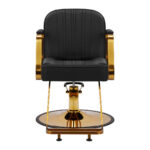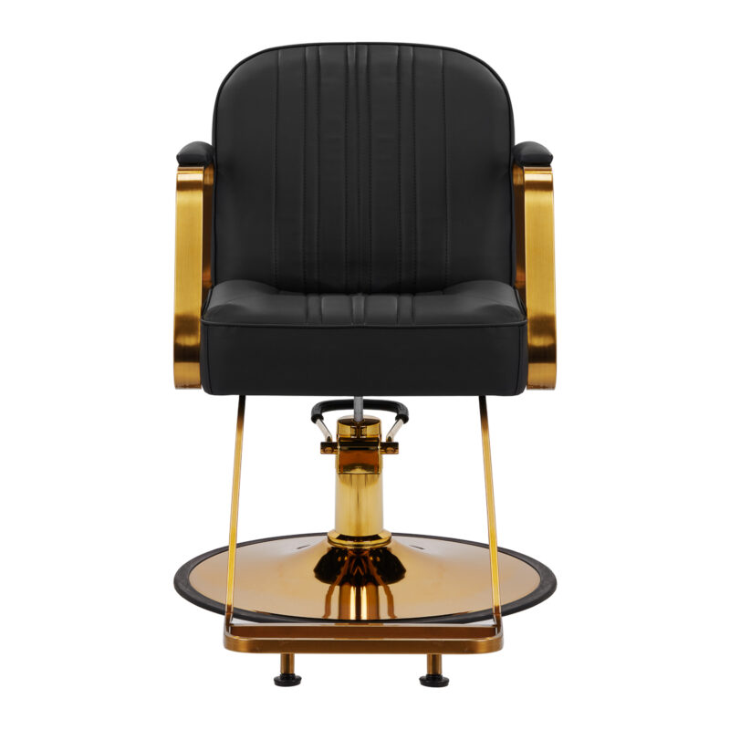 Mechanizm pełnego obrotu, w który jest wyposażony fotel, sprawia, że praca fryzjera staje się bardziej efektywna i wygodna. Solidna, okrągła podstawa gwarantuje stabilność w trakcie użytkowania. Polerowana, gładka powierzchnia nadaje elementowi elegancki wygląd i sprawia, że ten jest łatwy do utrzymania w czystości. Wygodne siedzisko z wypełnieniem z miękkiej pianki zapewnia wysoki komfort użytkowania, nawet podczas wielogodzinnych zabiegów. Częściowo tapicerowane, metalowe podłokietniki o ciekawym kształcie pozwalają na prawidłowe ułożenie barków klienta – sprawia to, że nie chowa głowy w ramionach ani się nie garbi – co wyraźnie ułatwia wykonywanie precyzyjnych zabiegów, w tym strzyżenia.