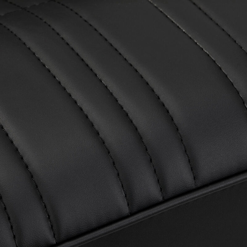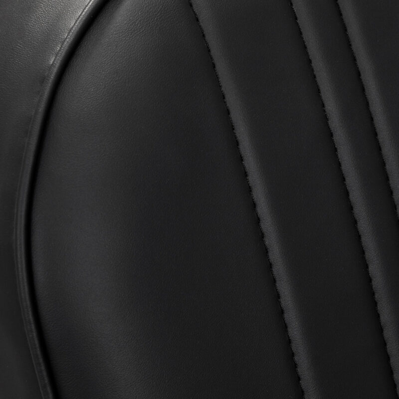 Wypełnienie z trwałej, odpornej na odkształcenia pianki oraz obicie wykonane z przyjemnej w dotyku skóry syntetycznej zapewniają trwałość mebla i jego komfortowe użytkowanie na przestrzeni lat. Zastosowane materiały sprawiają również, że sprzęt jest odporny na wilgoć, wytrzymały oraz łatwy do czyszczenia. Pokrycie w odcieniach czerni, estetyczne przeszycia oraz elementy w odcieniach złota nadają mu niepowtarzalnego charakteru. Nowoczesny design tego sprzętu sprawia, że idealnie wpisuje się w atmosferę wielu profesjonalnych salonów, nadając im wyjątkowego stylu.