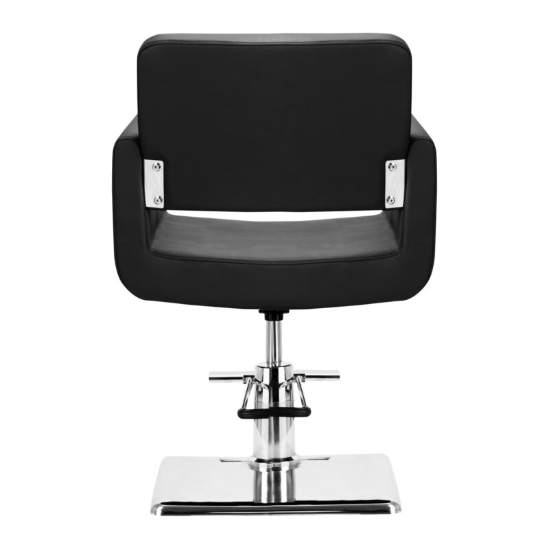 Solidna, kwadratowa podstawa zapewnia stabilność podczas użytkowania, a jej polerowana, gładka powierzchnia nadaje elegancki wygląd. Siedzisko wypełnione trwałą, odporną na odkształcenia pianką oraz obite przyjemną w dotyku skórą syntetyczną jest wytrzymałe, odporne na wilgoć i łatwe do czyszczenia. Klasyczna czerń podkreśla ponadczasowy design, który harmonijnie wpisuje się zarówno w nowoczesne, jak i tradycyjne wnętrza salonów fryzjerskich.