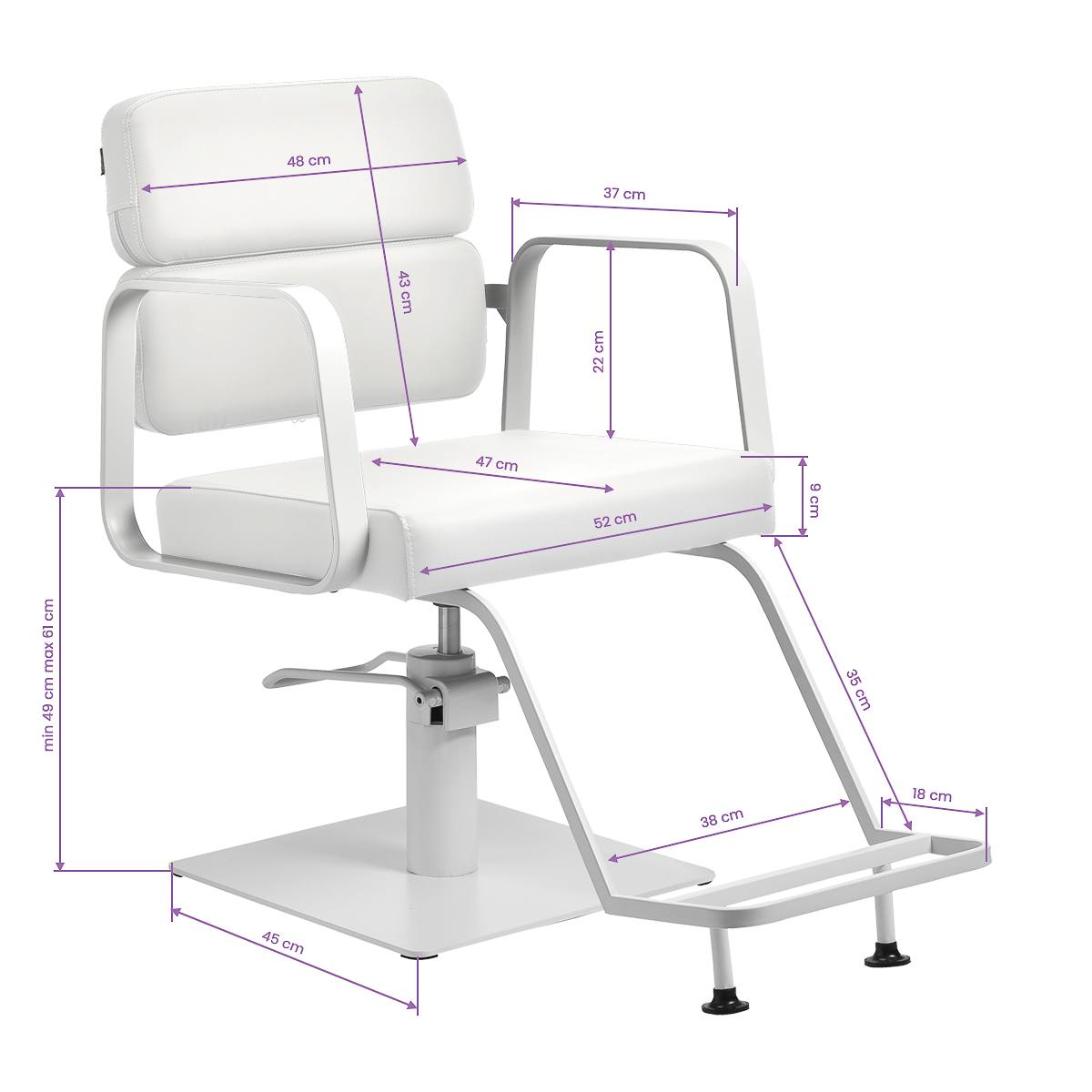 - Podnośnik hydrauliczny – regulacja wysokości w zakresie 49-61 cm umożliwia wygodne dopasowanie do wzrostu fryzjera i klienta.