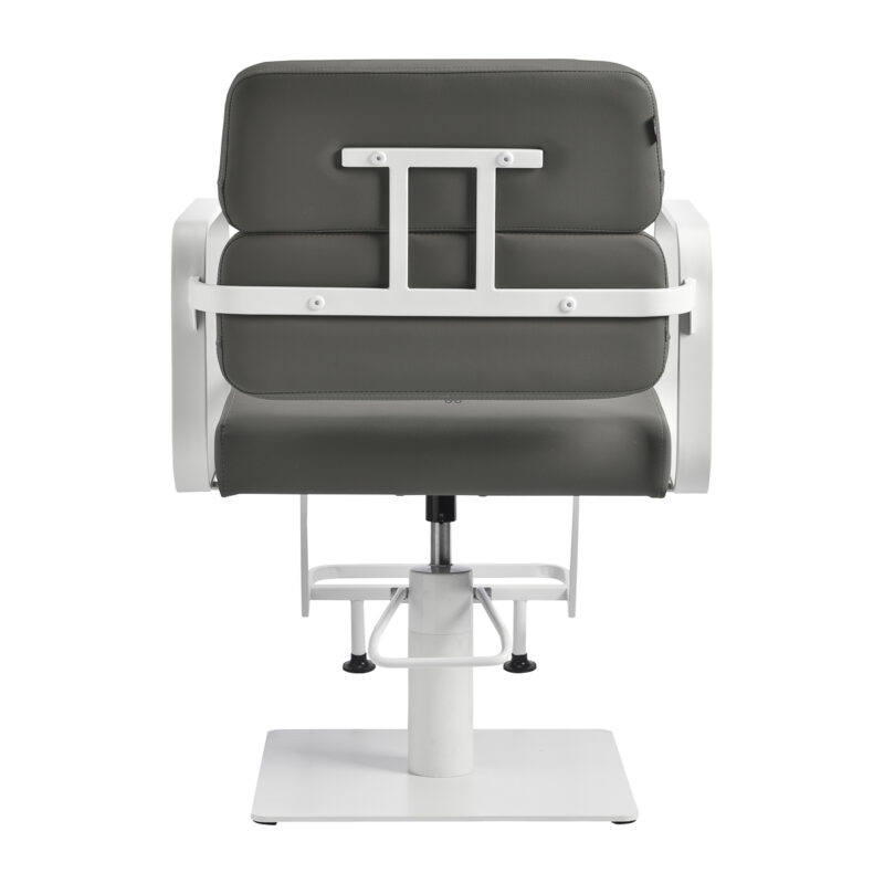 Stylowy fotel fryzjerski Gabbiano Porto z hydraulicznym podnośnikiem. Komfort, stabilność i elegancki design w odcieniach szarości i bieli. Idealny do profesjonalnego salonu fryzjerskiego.