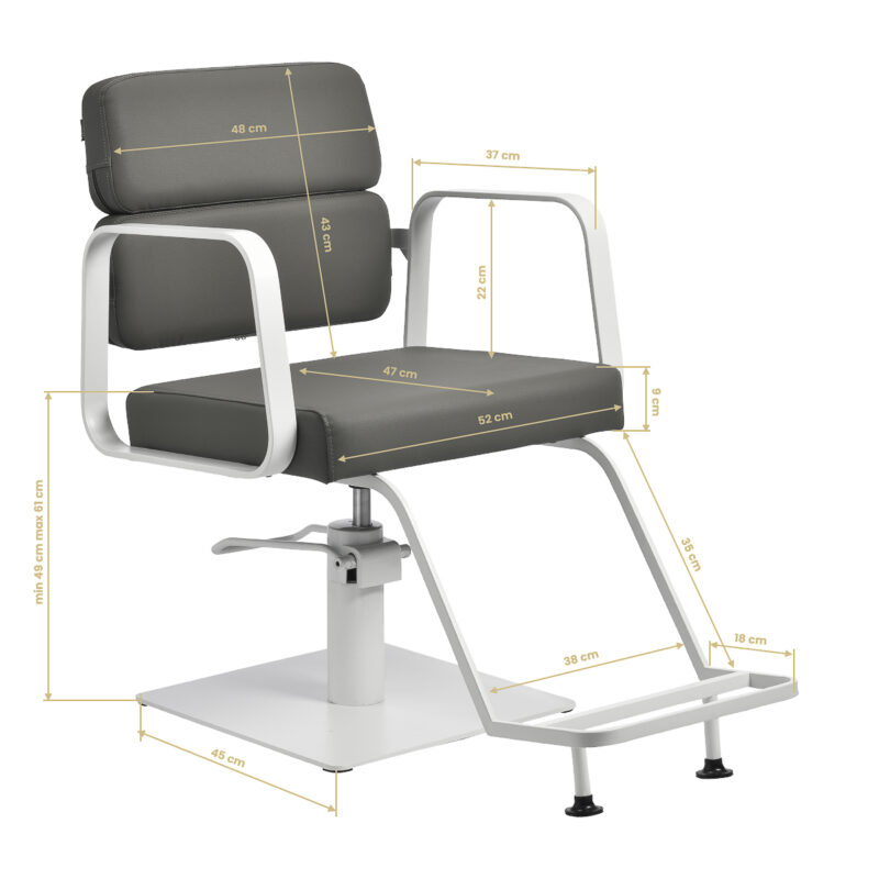 Elegancki fotel fryzjerski Gabbiano Porto to połączenie nowoczesnego designu, komfortu i ergonomii pracy. Wyposażony w wydajny podnośnik hydrauliczny, pozwala na płynną regulację wysokości siedziska nawet w trakcie siedzenia klienta. Jego estetyczne wykonanie i elegancka kolorystyka w odcieniach szarości sprawiają, że doskonale wkomponuje się w wystrój każdego profesjonalnego salonu fryzjerskiego.