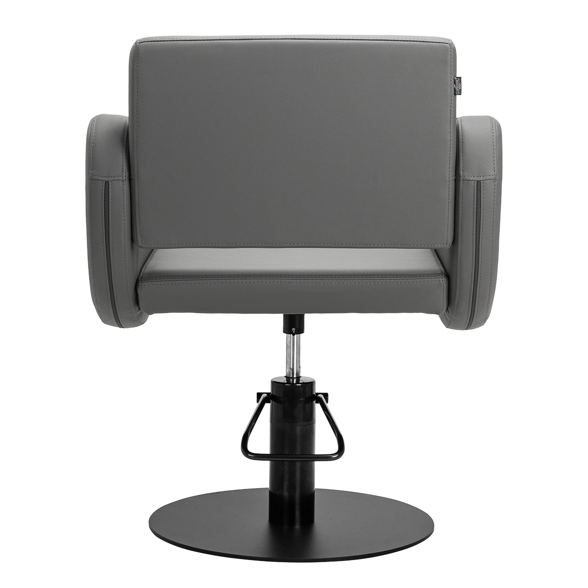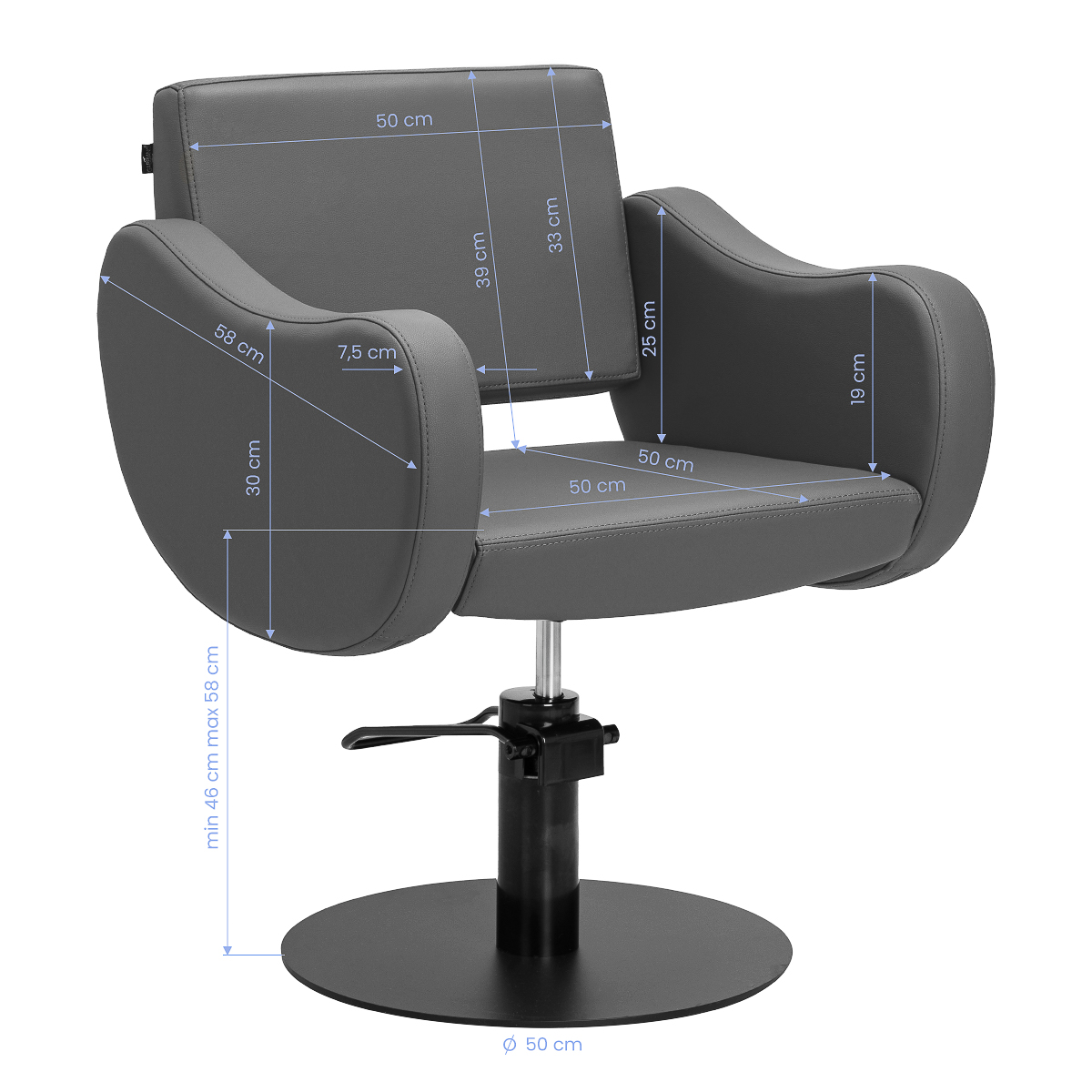 Solidny podnośnik hydrauliczny umożliwia płynną regulację wysokości siedziska w zakresie od 46 do 58 cm – również, gdy klient siedzi na fotelu. To praktyczne rozwiązanie pozwala łatwo dostosować pozycję do wzrostu zarówno klienta, jak i stylisty, wspierając ergonomiczną pracę. Profilowane oparcie zapewnia wygodną pozycję i stabilne podparcie pleców, co ma szczególne znaczenie podczas dłuższych zabiegów. Dodatkowym atutem jest mechanizm pełnego obrotu, który zwiększa swobodę ruchu i ułatwia dostęp do klienta z każdej strony.