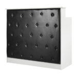 Mebel ten wykonano z wysokiej jakości, trwałej płyty laminowanej w odcieniach bieli, a gładkie powierzchnie nie sprawiają problemów w utrzymaniu czystości – w razie zabrudzenia wystarczy przetrzeć je wilgotną ściereczką. Ozdobna część frontalna została obita skórą syntetyczną w odcieniach czerni, co nadaje jej stylowego sznytu, zapewnia trwałość mebla oraz łatwość czyszczenia. Ozdobne guziki dodają elegancji i wyjątkowości, podkreślając charakter wnętrza. Recepcja została starannie wykonana, jest stabilna, a zastosowane materiały pozwalają na wieloletnie efektywne użytkowanie.