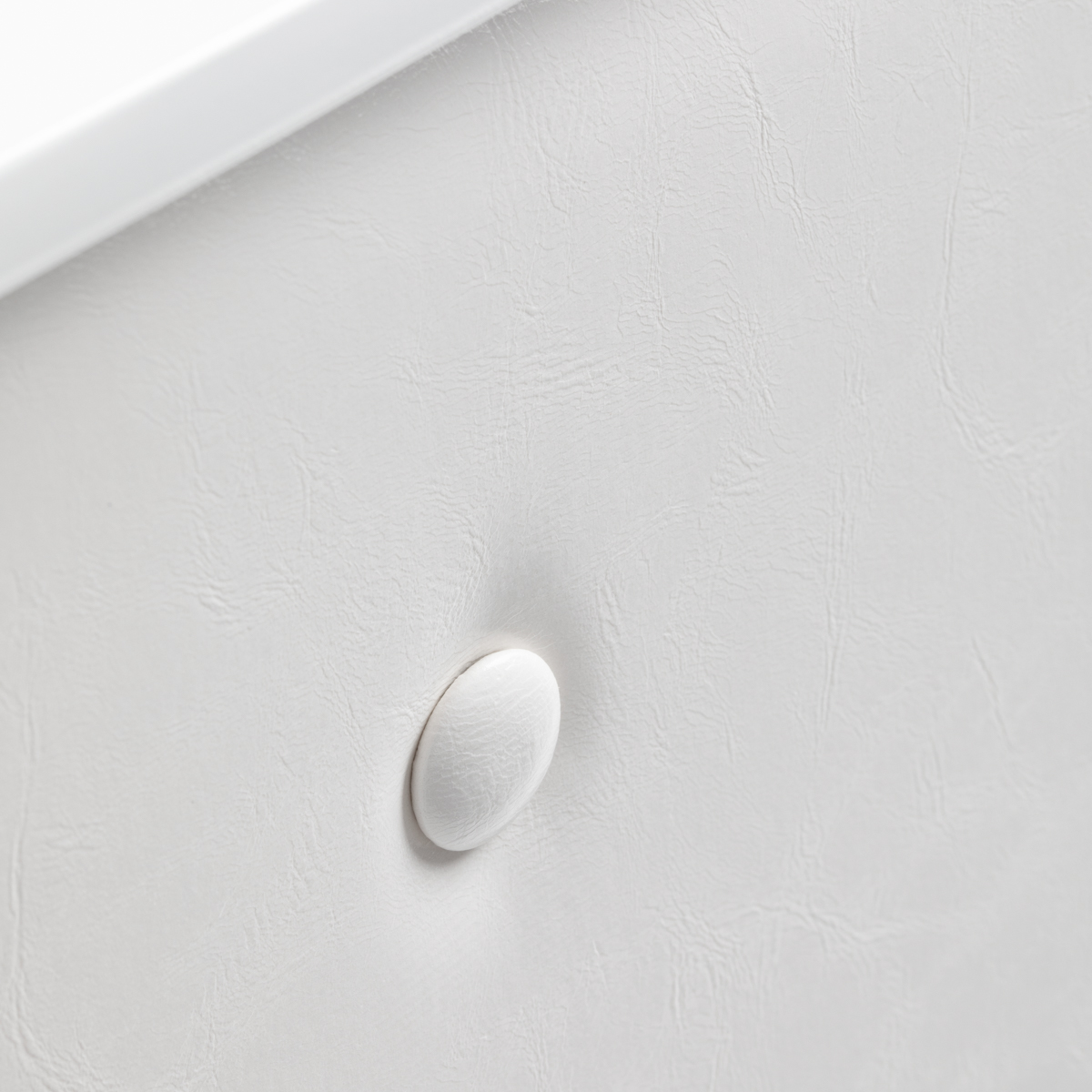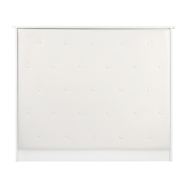 Mebel ten wykonano z wysokiej jakości, trwałej płyty laminowanej w odcieniach bieli, a gładkie powierzchnie nie sprawiają problemów w utrzymaniu czystości – w razie zabrudzenia wystarczy przetrzeć je wilgotną ściereczką. Ozdobna część frontalna została obita skórą syntetyczną w odcieniach bieli, co nadaje jej stylowego sznytu, zapewnia trwałość mebla oraz łatwość czyszczenia. Ozdobne guziki dodają elegancji i wyjątkowości, podkreślając charakter wnętrza. Recepcja została starannie wykonana, jest stabilna, a zastosowane materiały pozwalają na wieloletnie efektywne użytkowanie.