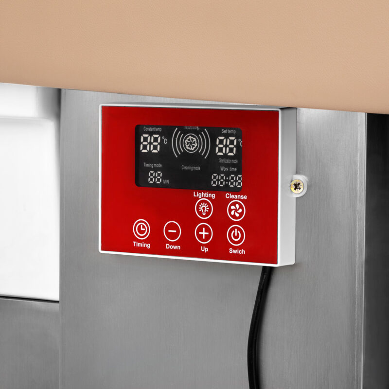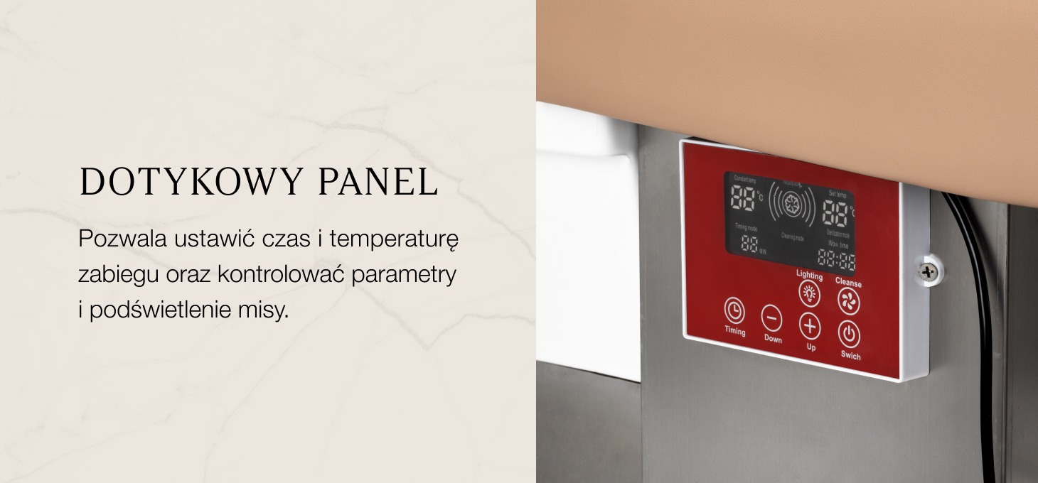 Intuicyjny panel dotykowy umożliwia pełną kontrolę nad parametrami zabiegu, zapewniając wygodę użytkowania. Umożliwia regulację czasu pracy oraz temperatury wody, a także monitorowanie ich aktualnych wartości. Dzięki wbudowanemu wyświetlaczowi możesz w każdej chwili sprawdzić, ile czasu urządzenie już pracuje. Panel pozwala również na włączenie funkcji światłoterapii, czyli podświetlenia misy, tworząc atmosferę relaksu i luksusu. Dodatkowo, urządzenie do terapii parowej wyposażone jest w pilota umożliwiającego wygodną obsługę na odległość.