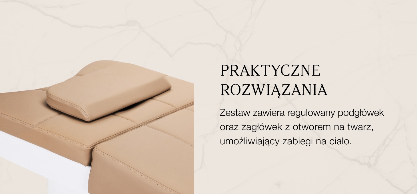 Regulowany podgłówek z możliwością wysuwania i zmiany kąta nachylenia zapewnia idealne dopasowanie do potrzeb użytkownika, zwiększając wygodę podczas zabiegów. W zestawie znajdują się również ergonomiczne poduszki, w tym zagłówek z otworem na twarz, który umożliwia wykonywanie nie tylko procedur pielęgnacyjnych skóry głowy, ale także masaży oraz różnorodnych zabiegów na ciało i twarz. Dzięki tym praktycznym rozwiązaniom, leżanka staje się wszechstronnym elementem wyposażenia salonów beauty & wellness, gwarantując komfort oraz efektywność każdej terapii.
