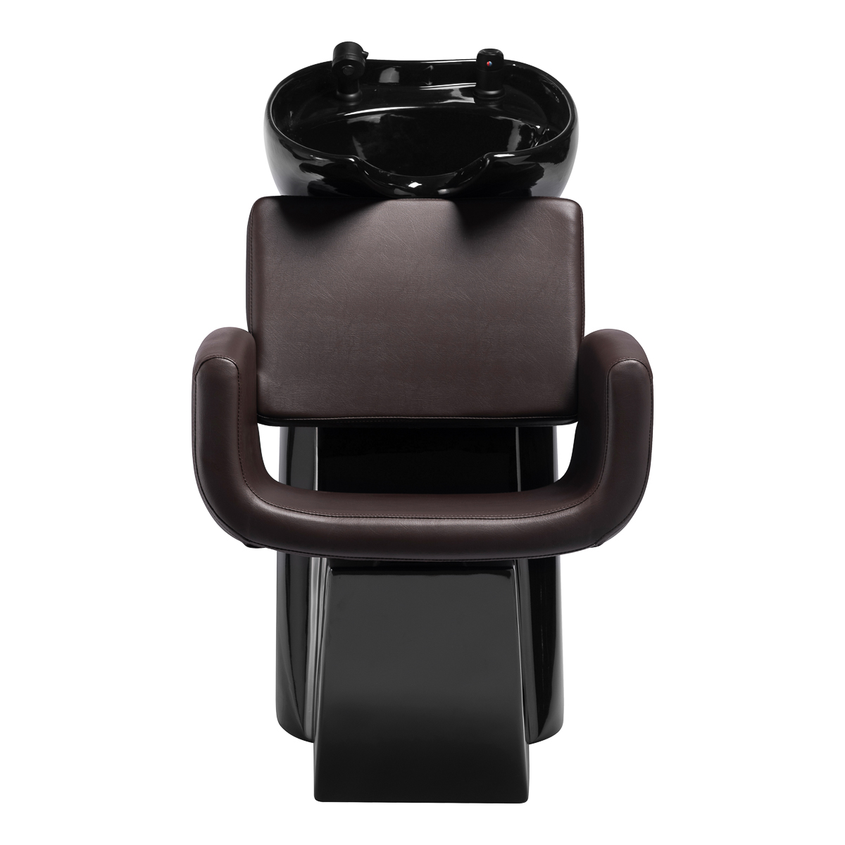 Minimalistyczny fotel o charakterystycznie zaokrąglonym siedzisku łączy prostotę formy z wysokim komfortem użytkowania. Oparcie o optymalnym kącie nachylenia wspiera naturalną pozycję ciała. Tapicerka wykonana z wysokiej jakości skóry syntetycznej w odcieniach brązu jest odporna na zużycie i łatwa do utrzymania w czystości. Nowoczesna linia mebla podkreśla elegancki charakter myjni oraz doskonale komponuje się z wystrojem salonu. W zestawie znajduje się kompletna armatura o matowym wykończeniu w odcieniach czerni, w tym bateria, słuchawka prysznicowa oraz dedykowane węże, aby zapewnić całkowity zestaw narzędzi do pracy.