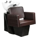 Profesjonalna myjnia fryzjerska -stabilna, niezwykle wygodna, solidnie wykonana. Nowoczeny design czyni z niej piękne dopełnienie wyposażenia nowoczesnego salonu fryzjerskiego. Siedzisko wykonane z wysokiej jakości ekoskóry, z ciekawym przeszyciem bocznym. Silikonowa podkładka pod głowę stabilizuje głowę klienta i pozwala na jej wygodne ułożenie na myjce. Misa myki w kolorze białym, z możliwością regulacji swojego nachylenia. Myjnia w kolorze czarno-brązowym