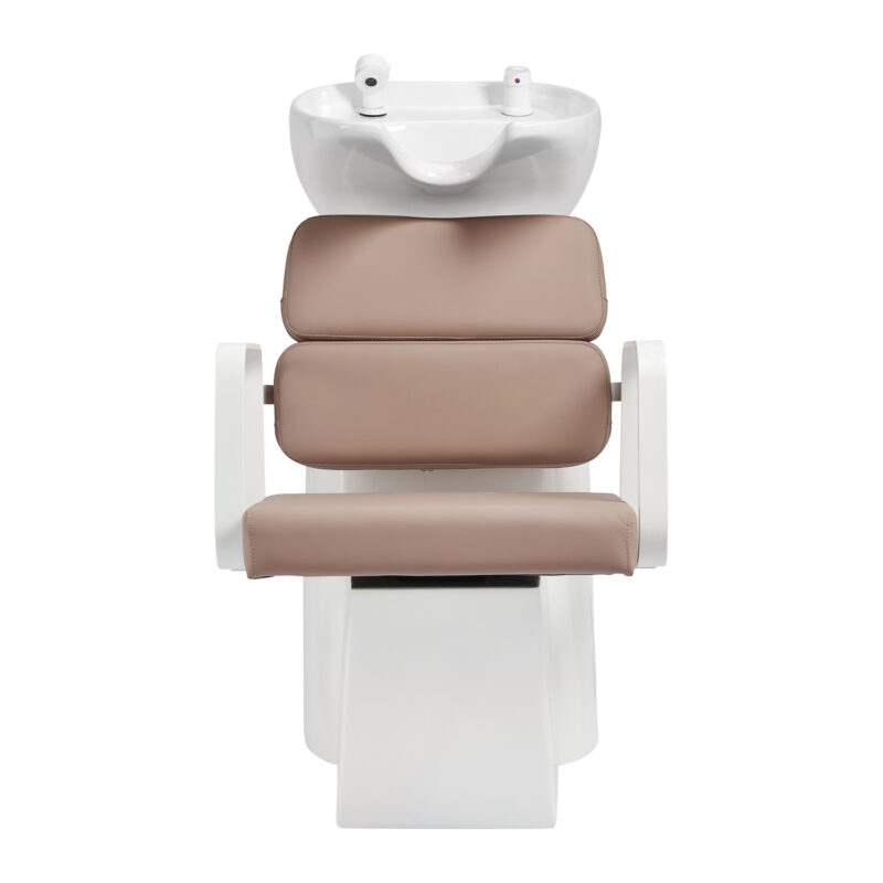 Wyprofilowany fotel zapewnia odpowiednie wsparcie lędźwi, a co za tym idzie wysoki komfort użytkowania. Metalowe podłokietniki w odcieniach bieli o geometrycznym kształcie pozwalają na prawidłowe ułożenie barków klienta. Wypełnienie z trwałej, odpornej na odkształcenia pianki oraz obicie wykonane z przyjemnej w dotyku skóry syntetycznej w odcieniach beżu zapewniają trwałość mebla, łatwość czyszczenia i komfortowe użytkowanie przez długi czas. Oryginalny, elegancki wygląd myjni nadaje wnętrzom niepowtarzalnego wyrazu. W zestawie znajduje się kompletna armatura w odcieniach bieli, w tym bateria, słuchawka prysznicowa oraz dedykowane węże, aby zapewnić kompletny zestaw narzędzi do pracy.
