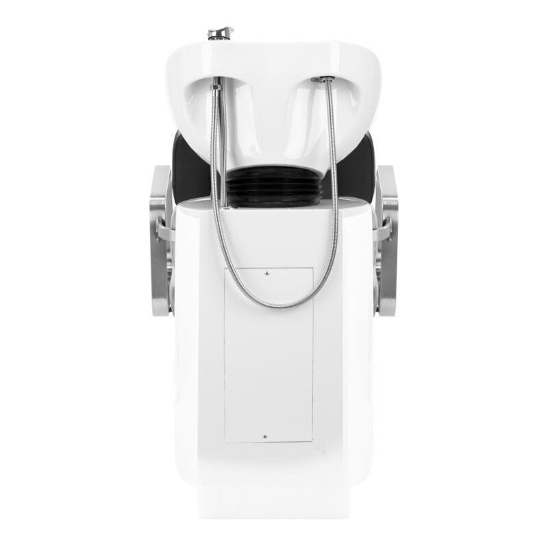 Praktyczna myjnia wyposażona została w baterię z mieszaczem, co zapewnia swobodny dostęp do ciepłej oraz zimnej wody. Ułatwia to dopasowanie temperatury do indywidualnych preferencji klienta. Dedykowane miejsce na odłożenie słuchawki usprawnia pracę, a chromowany korek ze specjalnym sitkiem pozwala na kontrolę przepływu wody oraz utrzymanie wysokich standardów higieny w salonie. Przyłącze wody zostało umieszczone wewnątrz podstawy, umożliwiając sprawne ukrywanie rur. Znacznym plusem tego modelu jest otwór pozostawiony pomiędzy oparciem a siedziskiem, który ułatwia zachowanie czystości w salonie, pozwalając w łatwy sposób wymieść zabrudzenia z każdego zakamarka fotela. Myjnia wyprofilowana została w taki sposób, by zapewniać wygodę podczas wykonywania różnorodnych zabiegów, gwarantując odpowiednie wsparcie pleców. Połączenie funkcjonalności i udogodnień sprawia, że praca w salonie fryzjerskim jest jeszcze bardziej komfortowa.
