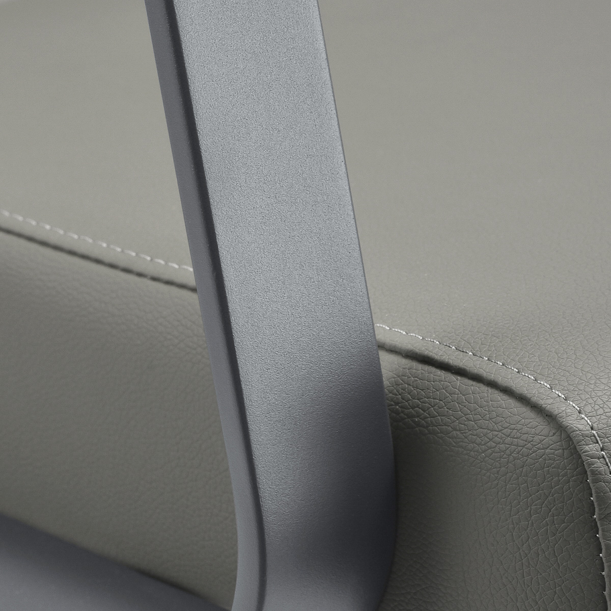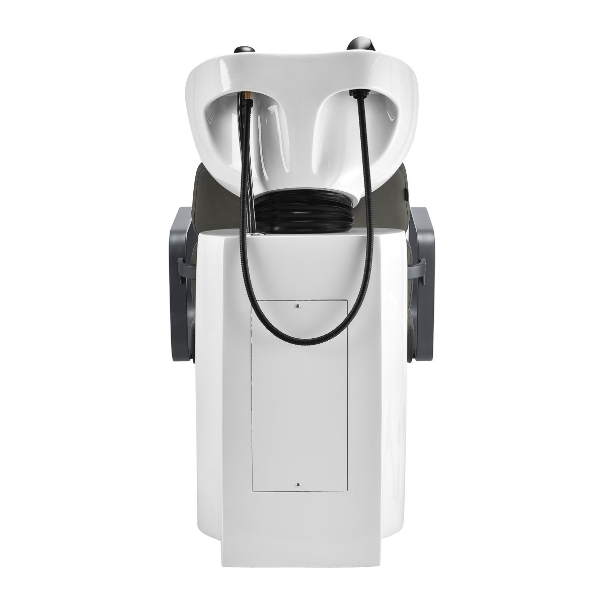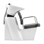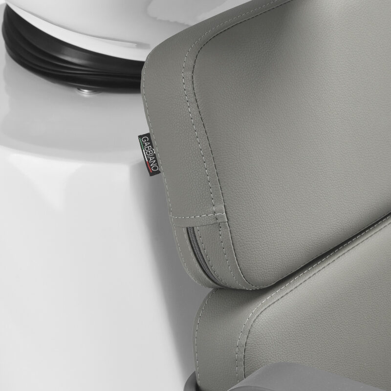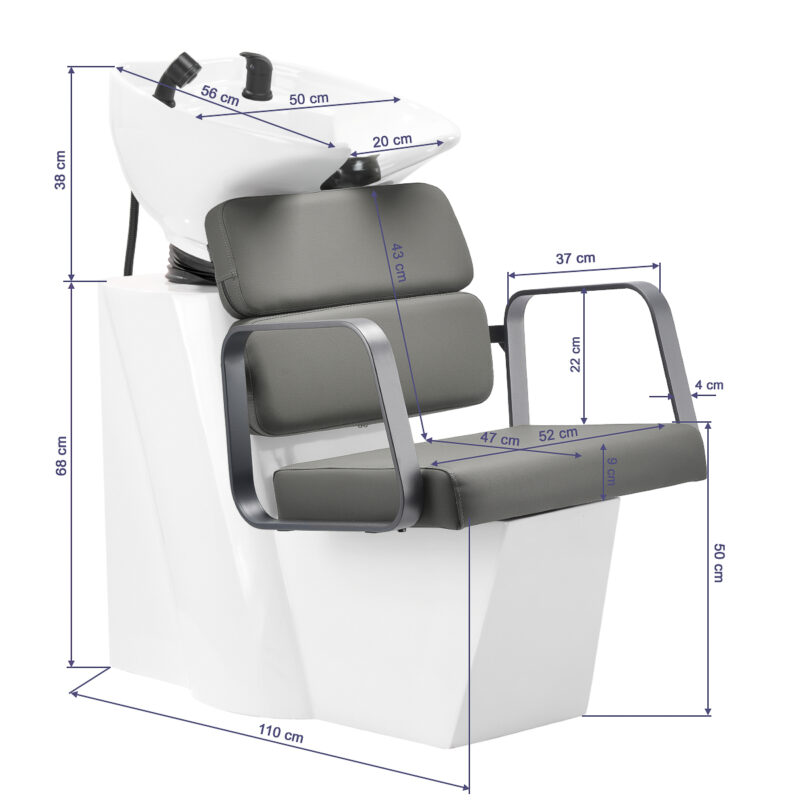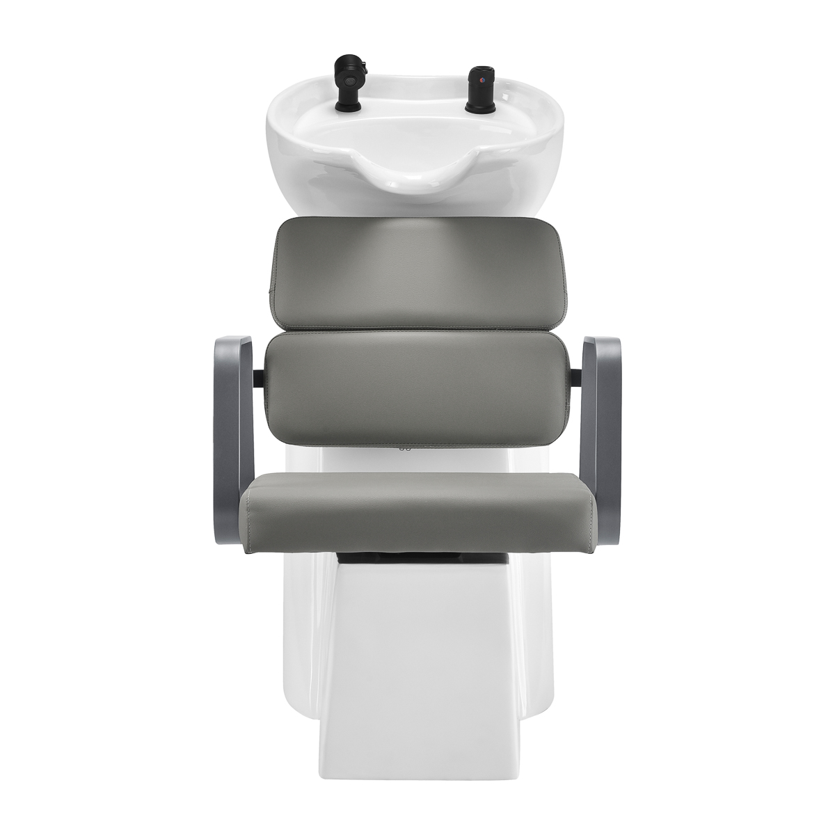 Wyprofilowany fotel zapewnia odpowiednie wsparcie lędźwi, a co za tym idzie wysoki komfort użytkowania. Metalowe podłokietniki w odcieniach szarości o geometrycznym kształcie pozwalają na prawidłowe ułożenie barków klienta. Wypełnienie z trwałej, odpornej na odkształcenia pianki oraz obicie wykonane z przyjemnej w dotyku skóry syntetycznej w odcieniach szarości zapewniają trwałość mebla, łatwość czyszczenia i komfortowe użytkowanie przez długi czas. Oryginalny, elegancki wygląd myjni nadaje wnętrzom niepowtarzalnego wyrazu. W zestawie znajduje się kompletna armatura w odcieniach czerni, w tym bateria, słuchawka prysznicowa oraz dedykowane węże, aby zapewnić kompletny zestaw narzędzi do pracy.