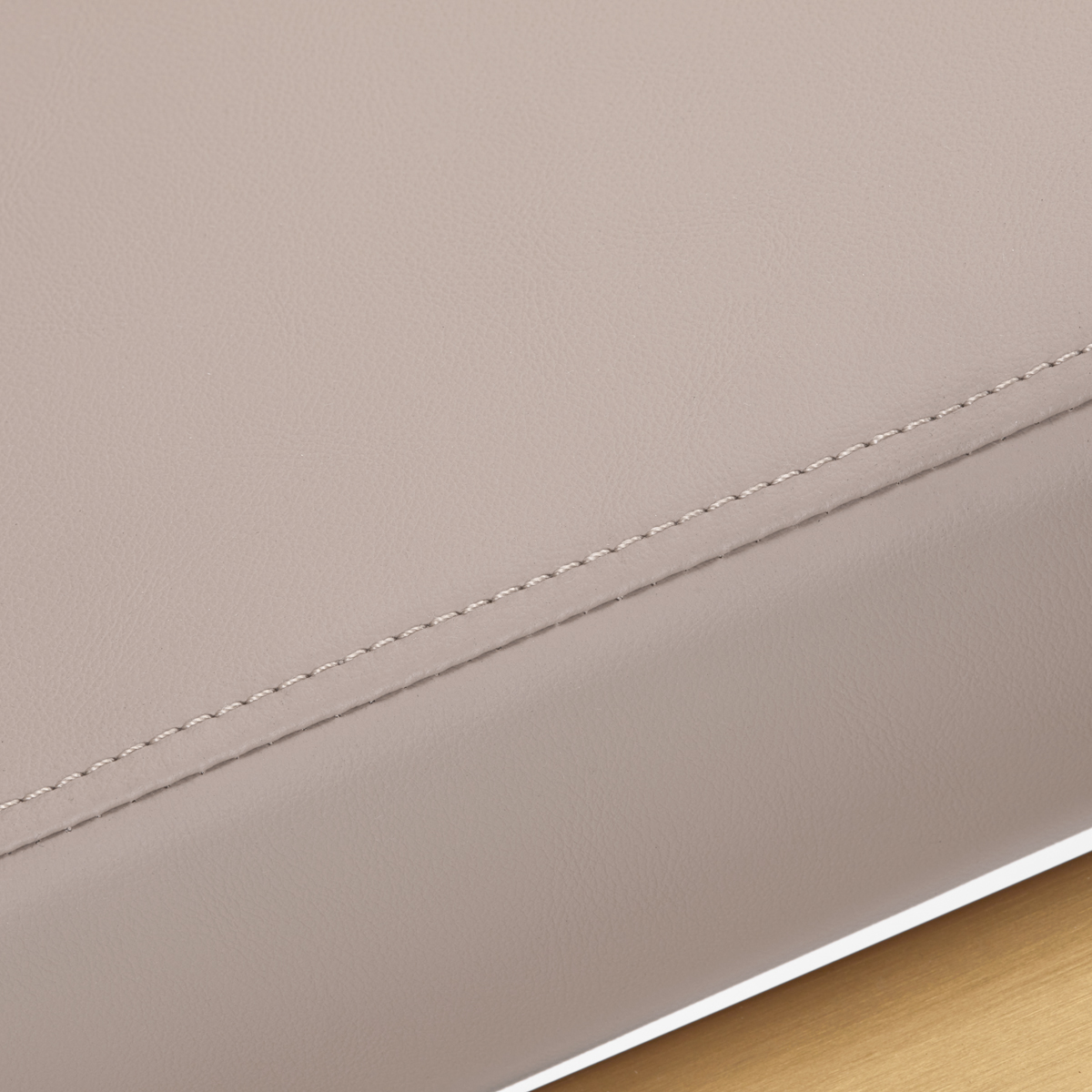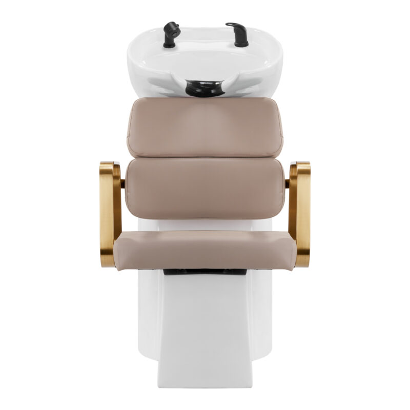 Wyprofilowany fotel zapewnia odpowiednie wsparcie lędźwi, a co za tym idzie wysoki komfort użytkowania. Metalowe podłokietniki w odcieniach złota o geometrycznym kształcie pozwalają na prawidłowe ułożenie barków klienta. Wypełnienie z trwałej, odpornej na odkształcenia pianki oraz obicie wykonane z przyjemnej w dotyku skóry syntetycznej w odcieniach beżu zapewniają trwałość mebla, łatwość czyszczenia i komfortowe użytkowanie przez długi czas. Oryginalny, elegancki wygląd myjni nadaje wnętrzom niepowtarzalnego wyrazu. W zestawie znajduje się kompletna armatura w odcieniach czerni, w tym bateria, słuchawka prysznicowa oraz dedykowane węże, aby zapewnić kompletny zestaw narzędzi do pracy.