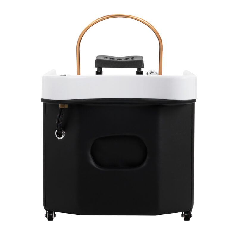 Urządzenie przyciąga wzrok nowoczesną formą i kontrastowym zestawieniem kolorów – eleganckiej bieli z głęboką czernią. Minimalistyczna bryła z zaokrąglonymi krawędziami prezentuje się stylowo i profesjonalnie, doskonale wpisując się w wystrój nowoczesnych salonów kosmetycznych oraz gabinetów SPA. Myjka wyposażona jest w kółka z możliwością blokady, co zapewnia wygodę transportu oraz stabilność w trakcie użytkowania. To idealne rozwiązanie do mniejszych przestrzeni – jedno mobilne urządzenie może obsługiwać kilka stanowisk zabiegowych, co czyni je niezwykle funkcjonalnym i ekonomicznym wyborem.