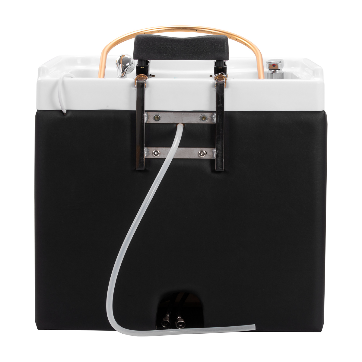 Myjnia jest wyposażona w baterię z mieszaczem, co umożliwia łatwe dopasowanie temperatury do preferencji klienta. Dedykowane miejsce na słuchawkę natryskową ułatwia pracę, a chromowany korek ze specjalnym sitkiem pozwala na kontrolę przepływu wody oraz utrzymanie wysokich standardów higieny w salonie. Przyłącze wody ukryto wewnątrz obudowy za osłoną z elastycznego materiału, co pozwala estetycznie zamaskować instalację hydrauliczną i zachować spójny, profesjonalny wygląd urządzenia.