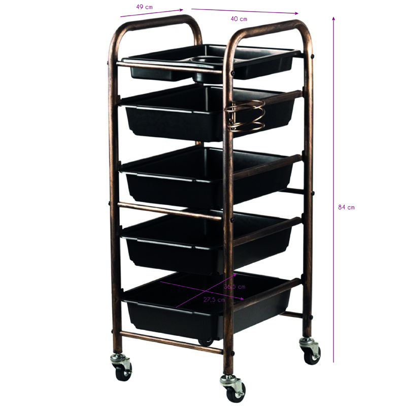 Pomocnik fryzjerski dwustronny w kolorze starego złota, posiada 4 kuwety i uchwyty na asortyment fryzjerski. Stablina konstrukcja zapewni długotrwałe użytkowanie. Stolik osadzony na gumowanych kółkach, dzięki którym narzędzia będą zawsze pod ręką.