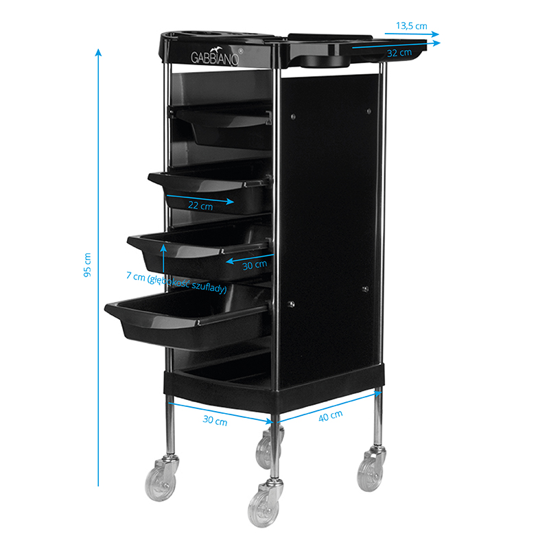 Pomocnik fryzjerski Gabbiano to wysokiej jakości mebel. Wykonany został w wytrzymałego tworzywa ABS ze stalową konstrukcją ramy, zapewniającą wysoką stabilność i wytrzymałość. Całość jest osadzona na bardzo wytrzymałych łożyskowanych, gumowych kółkach. Klasyczny kolor czerni idealnie dopasuje się do wystroju Twojego salonu!