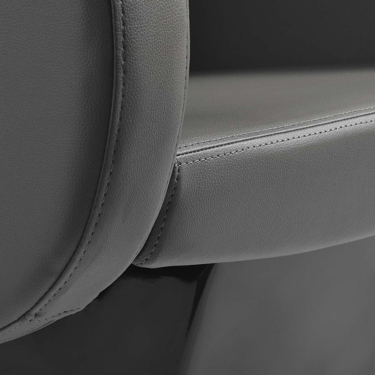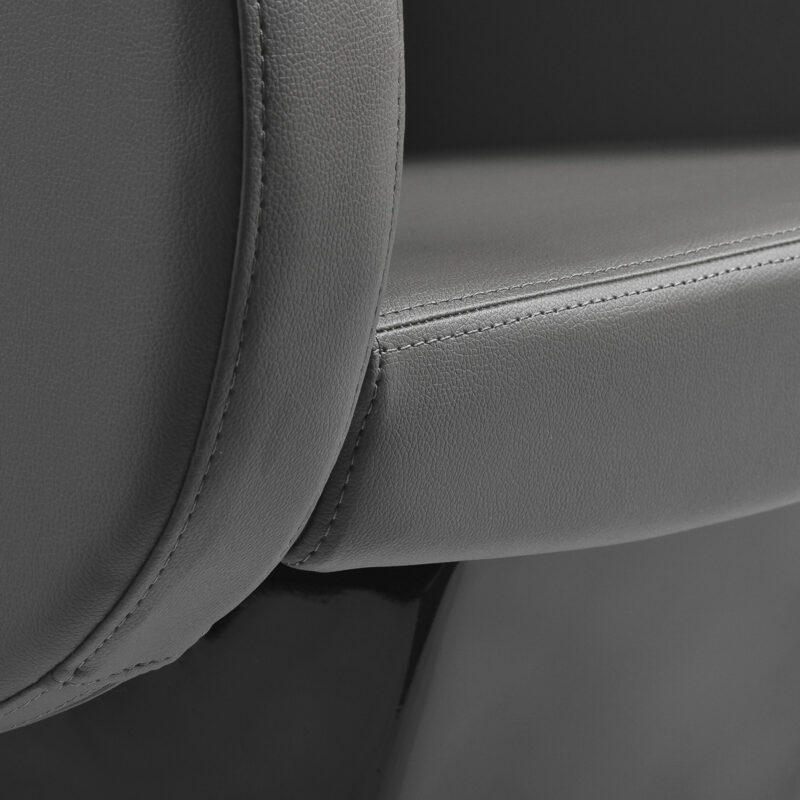 Fotel wypełniony trwałą pianką gwarantuje wysoki komfort użytkowania, a efektownie wyprofilowane podłokietniki pozwalają na wygodne ułożenie barków klienta. Oparcie pod optymalnym kątem wspiera kręgosłup, zapewniając pełen relaks. Pokrycie ze skóry syntetycznej w odcieniach szarości gwarantuje wytrzymałość oraz łatwość czyszczenia. Nowoczesna forma mebla podkreśla elegancki charakter wnętrza. W zestawie znajduje się kompletna armatura o matowym wykończeniu w odcieniach czerni, w tym bateria, słuchawka prysznicowa oraz dedykowane węże, aby zapewnić całkowity zestaw narzędzi do pracy