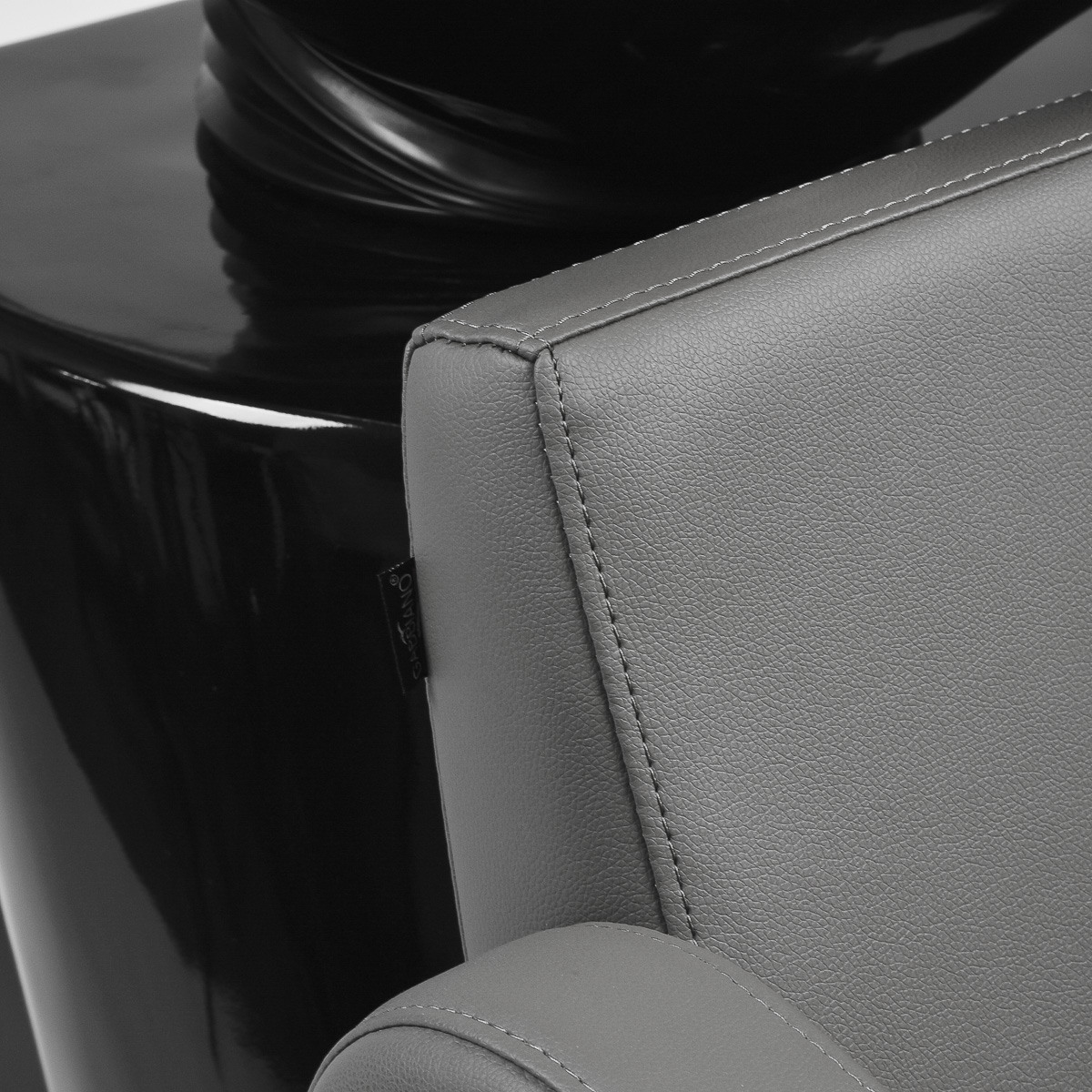 Ceramiczna misa w odcieniach czerni jest głęboka, co ogranicza rozchlapywanie wody i produktów używanych podczas zabiegów. Regulowany kąt nachylenia misy pozwala dopasować ją do indywidualnych potrzeb, a zastosowany materiał sprawia, że umywalka jest wytrzymała, odporna na przebarwienia i zadrapania oraz łatwa do utrzymania w czystości. Ergonomicznie wyprofilowany kołnierz gwarantuje wygodne podparcie głowy, natomiast miękka nakładka z tworzywa sztucznego w odcieniach czerni eliminuje uczucie chłodu ceramicznej powierzchni.