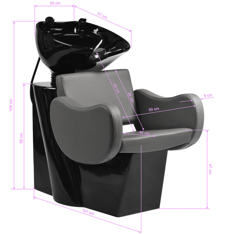 Myjnia jest wyposażona w baterię z mieszaczem, co zapewnia stały dostęp do ciepłej oraz zimnej wody oraz łatwe dopasowanie temperatury do preferencji klienta. Dedykowane miejsce na odłożenie słuchawki natryskowej ułatwia organizację pracy, a chromowany korek ze specjalnym sitkiem pozwala na kontrolę przepływu wody oraz utrzymanie wysokich standardów higieny. Przyłącze wody umieszczono wewnątrz podstawy, co umożliwia estetyczne ukrycie instalacji. Fotel zaprojektowano tak, by zapewniał wygodę podczas różnorodnych zabiegów. Połączenie praktycznych rozwiązań i ergonomicznych detali sprawia, że codzienna praca staje się jeszcze bardziej komfortowa.